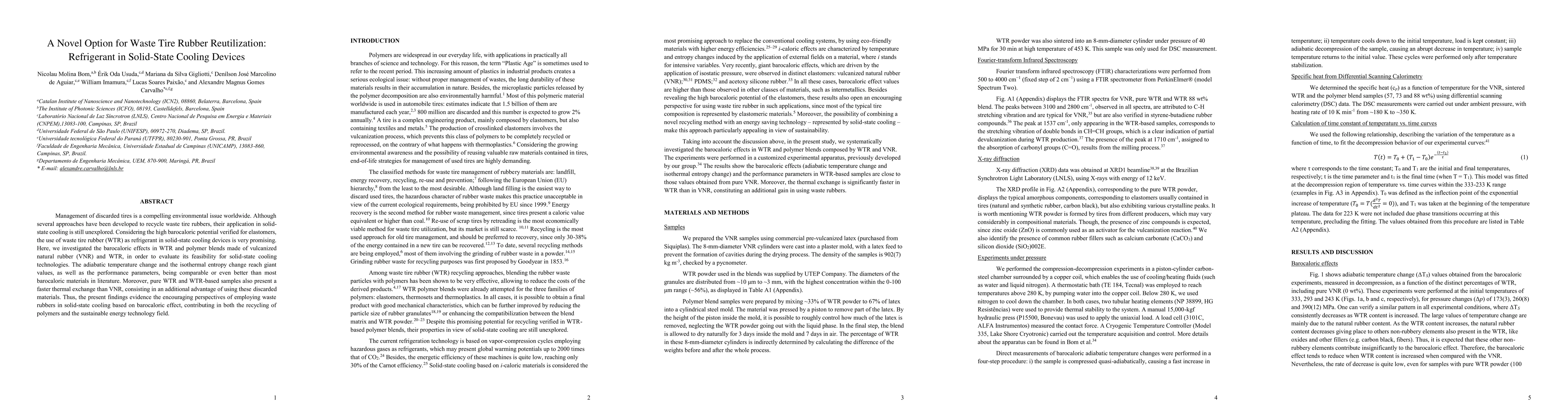 This paper explores the potential of waste tire rubber as a refrigerant in solid-state cooling devices, demonstrating significant barocaloric effects and comparable performance to other materials. The findings suggest that utilizing waste rubber in this manner can advance both polymer recycling and sustainable energy technologies.