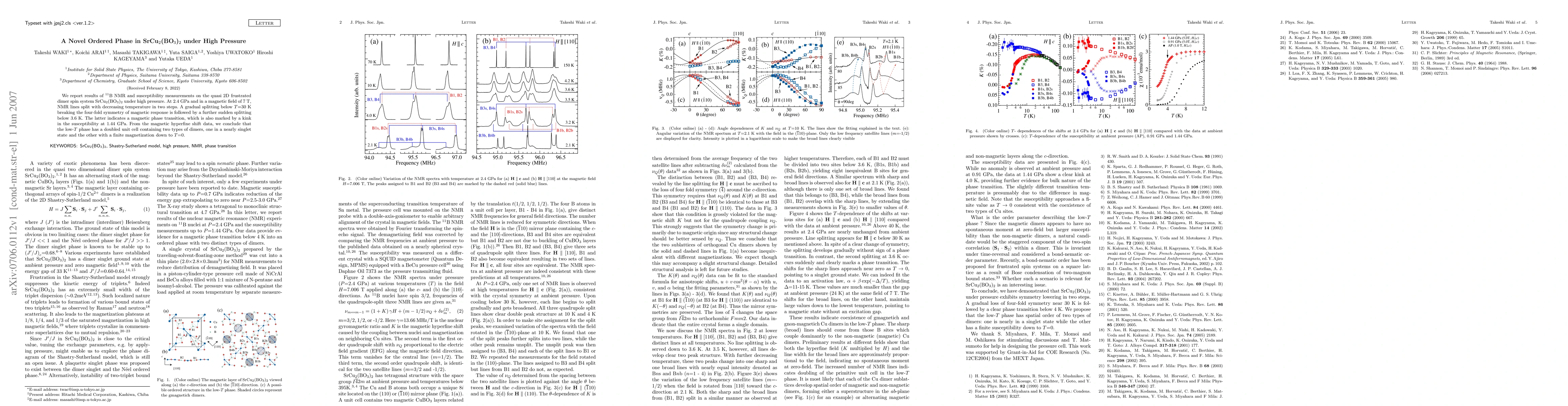 This study investigates the magnetic properties of SrCu2(BO3)2 under high pressure using 11B NMR and susceptibility measurements. At 2.4 GPa and 7 T, the material exhibits a gradual magnetic symmetry breaking below 30 K, followed by a sudden phase transition below 3.6 K, indicated by a susceptibility kink at 1.44 GPa.