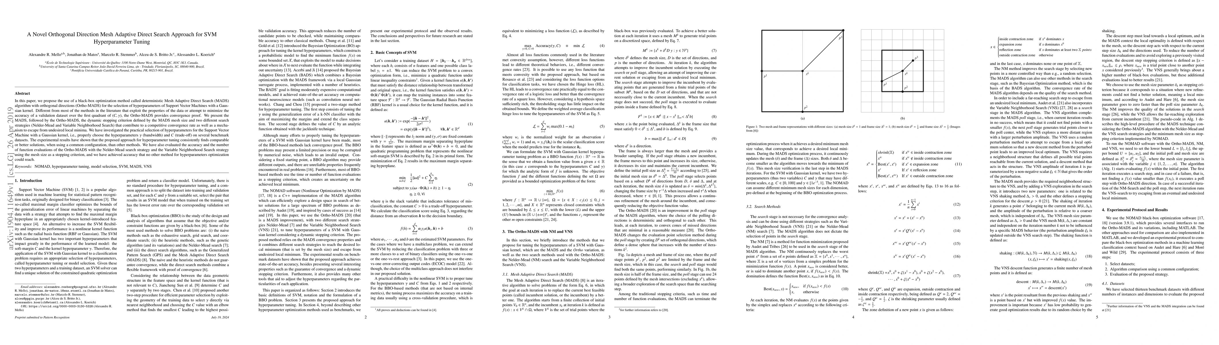 A new optimization method called Ortho-MADS is proposed for tuning Support Vector Machine hyperparameters, achieving comparable results to existing methods with improved convergence proof.