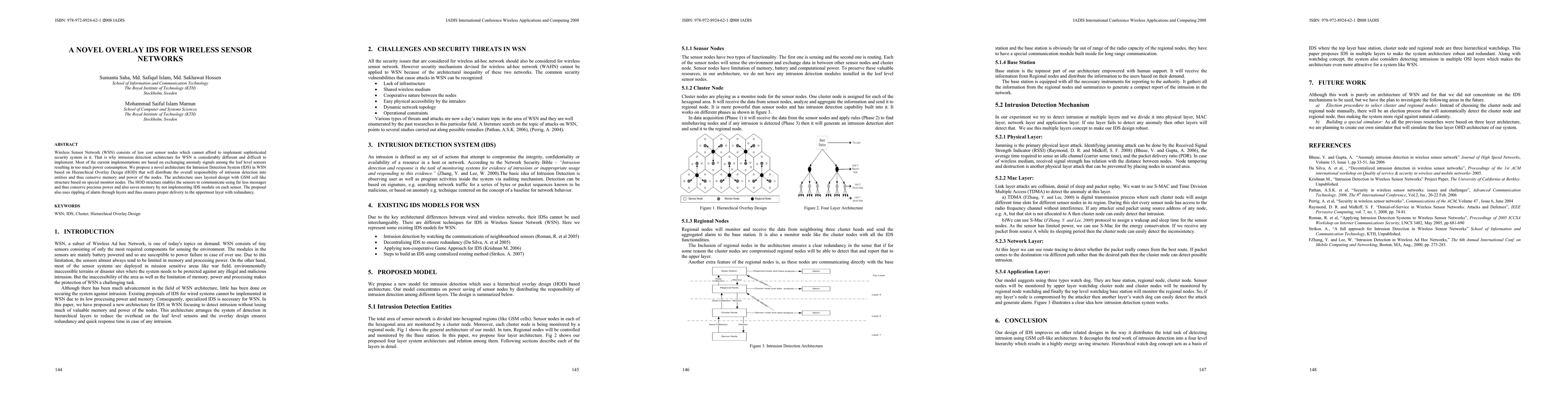 This paper presents a novel Hierarchical Overlay Design (HOD) for an Intrusion Detection System (IDS) in Wireless Sensor Networks (WSN) to reduce power consumption and memory usage. The proposed HOD architecture distributes intrusion detection responsibilities among entities, minimizing message exchanges and conserving sensor resources.