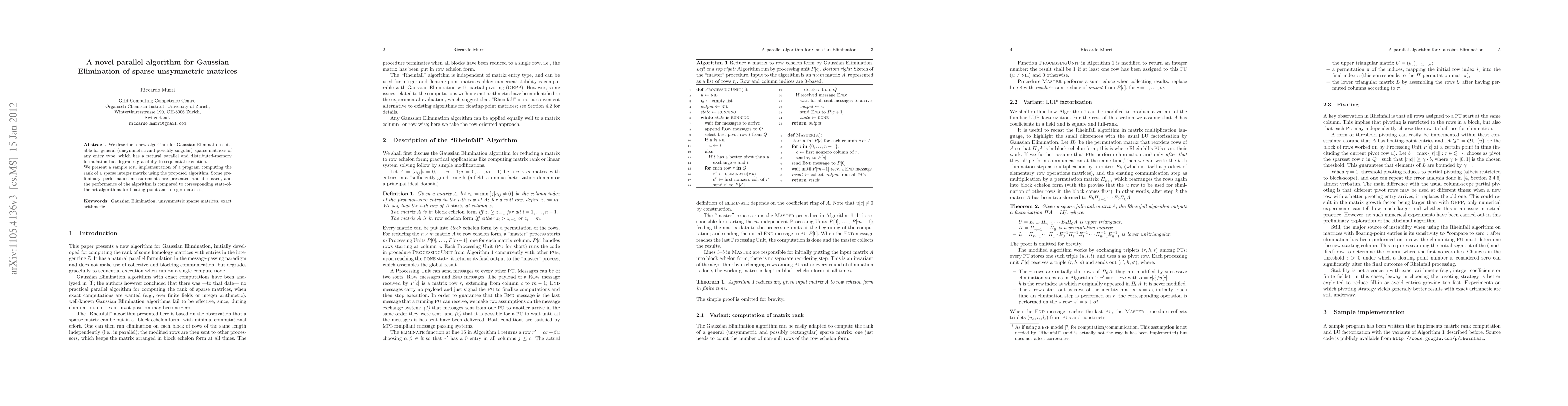 We describe a new algorithm for Gaussian Elimination suitable for general (unsymmetric and possibly singular) sparse matrices, of any entry type, which has a natural parallel and distributed-memory formulation but degrades gracefully to sequential execution. We present a sample MPI implementation of a program computing the rank of a sparse integer matrix using the proposed algorithm. Some preliminary performance measurements are presented and discussed, and the performance of the algorithm is compared to corresponding state-of-the-art algorithms for floating-point and integer matrices.