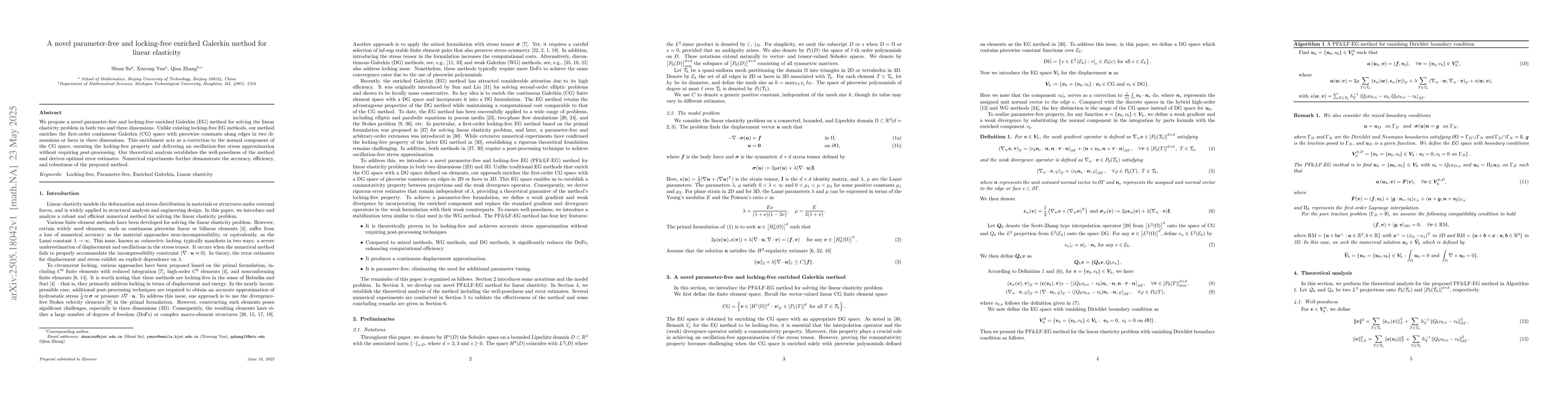 This work is novel due to its parameter-free and locking-free approach, distinct from existing locking-free EG methods that require post-processing, and its application to both 2D and 3D problems.