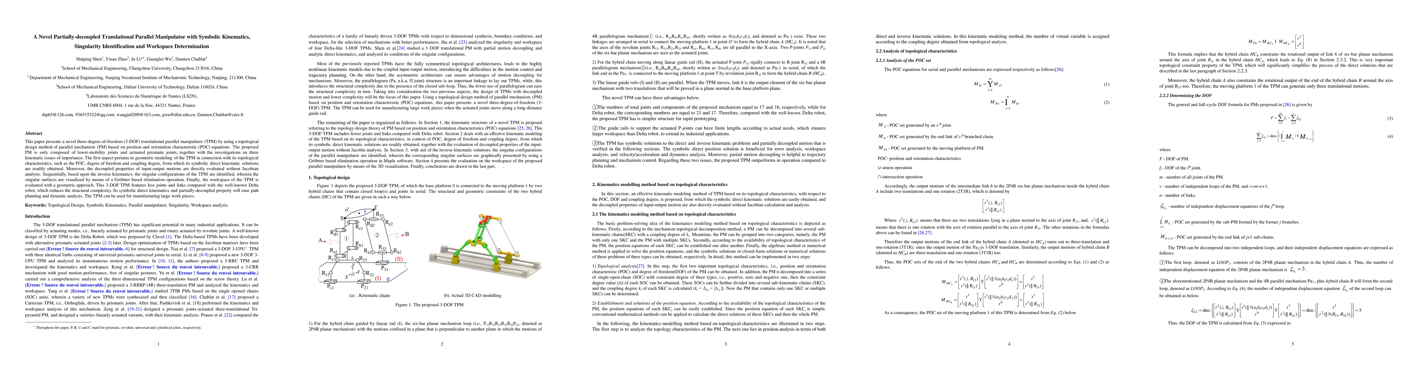 This paper introduces a novel 3-DOF translational parallel manipulator with symbolic kinematics and partial decoupling, simplifying path planning and dynamic analysis. The study also identifies singular configurations and determines the workspace using a geometric approach.