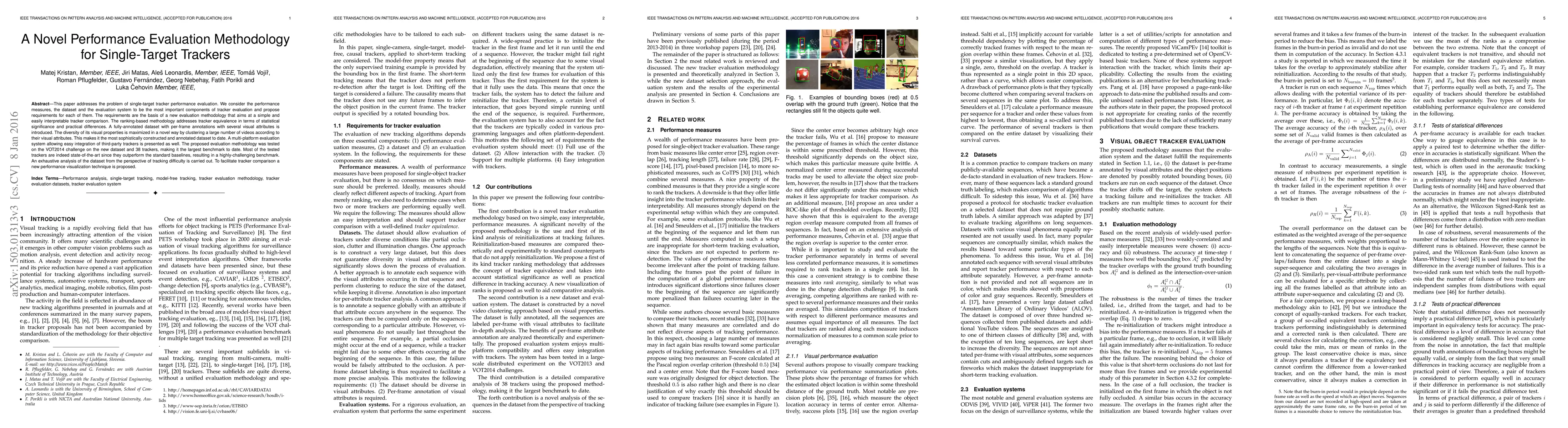 This paper addresses the problem of single-target tracker performance evaluation. We consider the performance measures, the dataset and the evaluation system to be the most important components of tracker evaluation and propose requirements for each of them. The requirements are the basis of a new evaluation methodology that aims at a simple and easily interpretable tracker comparison. The ranking-based methodology addresses tracker equivalence in terms of statistical significance and practical differences. A fully-annotated dataset with per-frame annotations with several visual attributes is introduced. The diversity of its visual properties is maximized in a novel way by clustering a large number of videos according to their visual attributes. This makes it the most sophistically constructed and annotated dataset to date. A multi-platform evaluation system allowing easy integration of third-party trackers is presented as well. The proposed evaluation methodology was tested on the VOT2014 challenge on the new dataset and 38 trackers, making it the largest benchmark to date. Most of the tested trackers are indeed state-of-the-art since they outperform the standard baselines, resulting in a highly-challenging benchmark. An exhaustive analysis of the dataset from the perspective of tracking difficulty is carried out. To facilitate tracker comparison a new performance visualization technique is proposed.