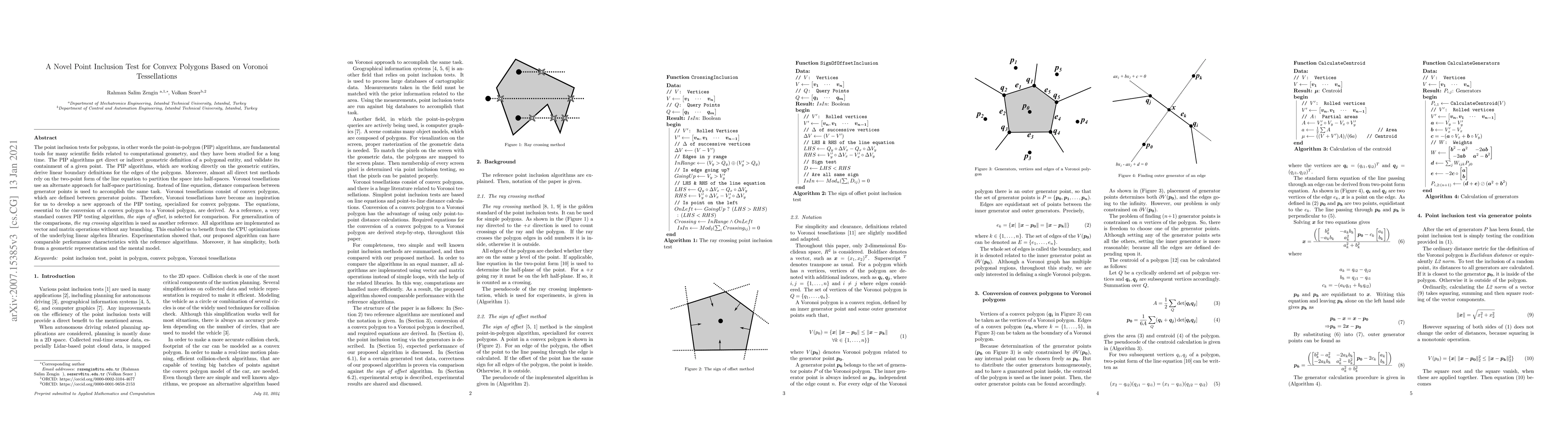 This paper proposes a novel point inclusion test for convex polygons based on Voronoi tessellations, contrasting traditional methods that rely on line equations. The new approach uses distance comparisons to partition space, showing comparable performance and simplicity in geometric representation.