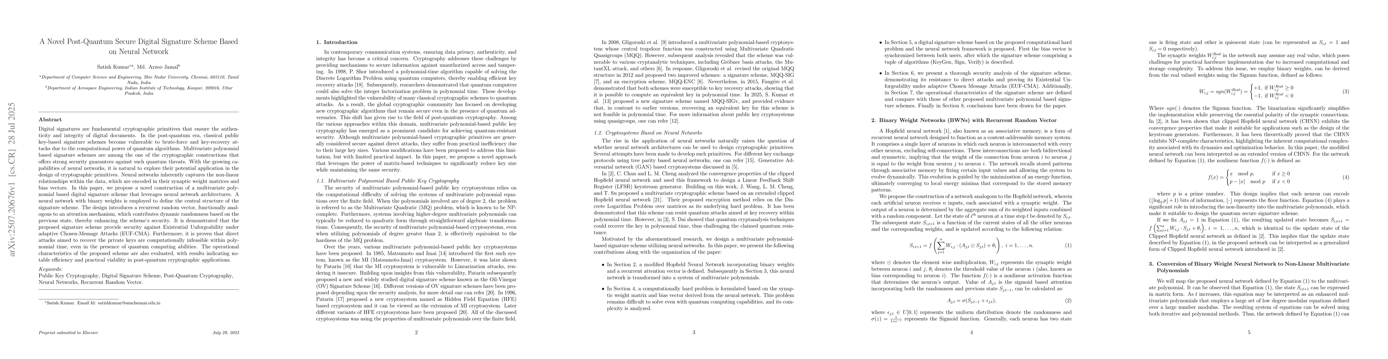 Digital signatures are fundamental cryptographic primitives that ensure the authenticity and integrity of digital documents. In the post-quantum era, classical public key-based signature schemes become vulnerable to brute-force and key-recovery attacks due to the computational power of quantum algorithms. Multivariate polynomial based signature schemes are among the one of the cryptographic constructions that offers strong security guarantees against such quantum threats. With the growing capabilities of neural networks, it is natural to explore their potential application in the design of cryptographic primitives. Neural networks inherently captures the non-linear relationships within the data, which are encoded in their synaptic weight matrices and bias vectors. In this paper, we propose a novel construction of a multivariate polynomial based digital signature scheme that leverages neural network architectures. A neural network with binary weights is employed to define the central structure of the signature scheme. The design introduces a recurrent random vector, functionally analogous to an attention mechanism, which contributes dynamic randomness based on the previous state, thereby enhancing the scheme's security. It is demonstrated that the proposed signature scheme provide security against Existential Unforgeability under adaptive Chosen-Message Attacks (EUF-CMA). Furthermore, it is proven that direct attacks aimed to recover the private keys are computationally infeasible within polynomial time, even in the presence of quantum computing abilities. The operational characteristics of the proposed scheme are also evaluated, with results indicating notable efficiency and practical viability in post-quantum cryptographic applications.