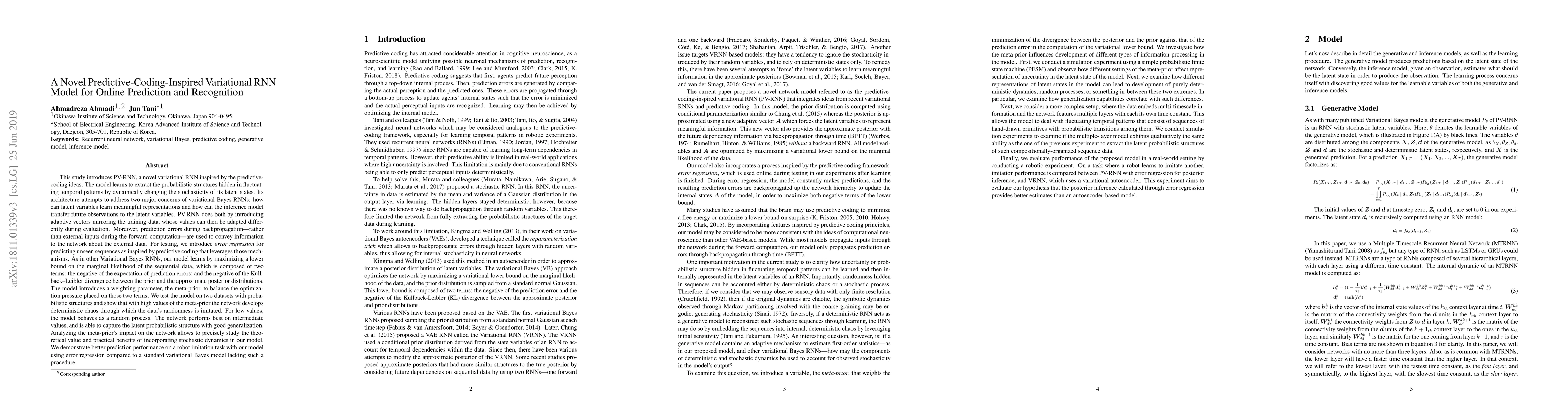This study introduces PV-RNN, a novel variational RNN inspired by the predictive-coding ideas. The model learns to extract the probabilistic structures hidden in fluctuating temporal patterns by dynamically changing the stochasticity of its latent states. Its architecture attempts to address two major concerns of variational Bayes RNNs: how can latent variables learn meaningful representations and how can the inference model transfer future observations to the latent variables. PV-RNN does both by introducing adaptive vectors mirroring the training data, whose values can then be adapted differently during evaluation. Moreover, prediction errors during backpropagation, rather than external inputs during the forward computation, are used to convey information to the network about the external data. For testing, we introduce error regression for predicting unseen sequences as inspired by predictive coding that leverages those mechanisms. The model introduces a weighting parameter, the meta-prior, to balance the optimization pressure placed on two terms of a lower bound on the marginal likelihood of the sequential data. We test the model on two datasets with probabilistic structures and show that with high values of the meta-prior the network develops deterministic chaos through which the data's randomness is imitated. For low values, the model behaves as a random process. The network performs best on intermediate values, and is able to capture the latent probabilistic structure with good generalization. Analyzing the meta-prior's impact on the network allows to precisely study the theoretical value and practical benefits of incorporating stochastic dynamics in our model. We demonstrate better prediction performance on a robot imitation task with our model using error regression compared to a standard variational Bayes model lacking such a procedure.