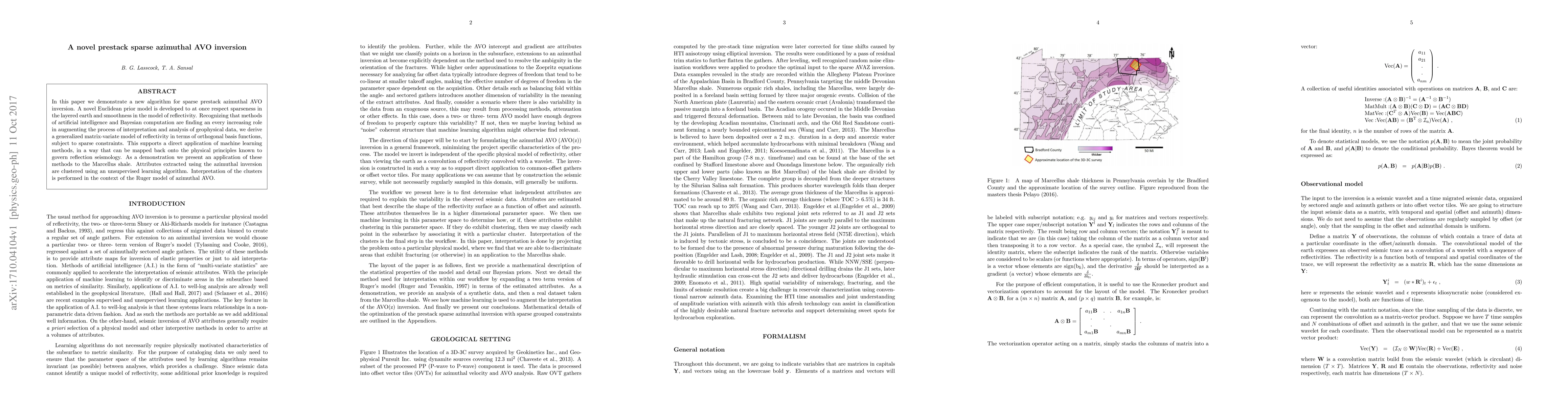 This paper introduces a new algorithm for sparse prestack azimuthal AVO inversion using a novel Euclidean prior model that balances sparseness and smoothness in reflectivity. The method leverages machine learning and Bayesian computation to interpret geophysical data and is demonstrated on the Marcellus shale, with clusters interpreted using the Ruger model.