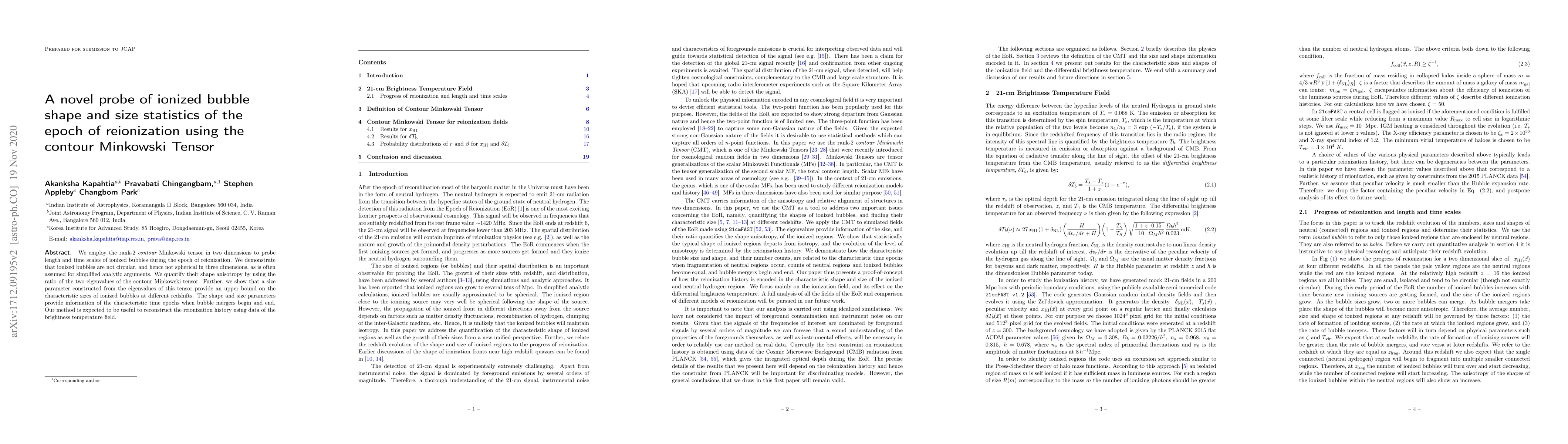 We employ the rank-2 {\em contour} Minkowski Tensor in two dimensions to probe length and time scales of ionized bubbles during the epoch of reionization. We demonstrate that the eigenvalues of this tensor provide excellent probes of the distribution of the sizes of ionized bubbles, and from it the characteristic bubble sizes, at different redshifts. We show that ionized bubbles are not circular, and hence not spherical in three dimensions, as is often assumed for simplified analytic arguments. We quantify their shape anisotropy by using the ratio of the two eigenvalues. The shape parameter provides the characteristic time epochs when bubble mergers begin and end. Our method will be very useful to reconstruct the reionization history using data of the brightness temperature field.