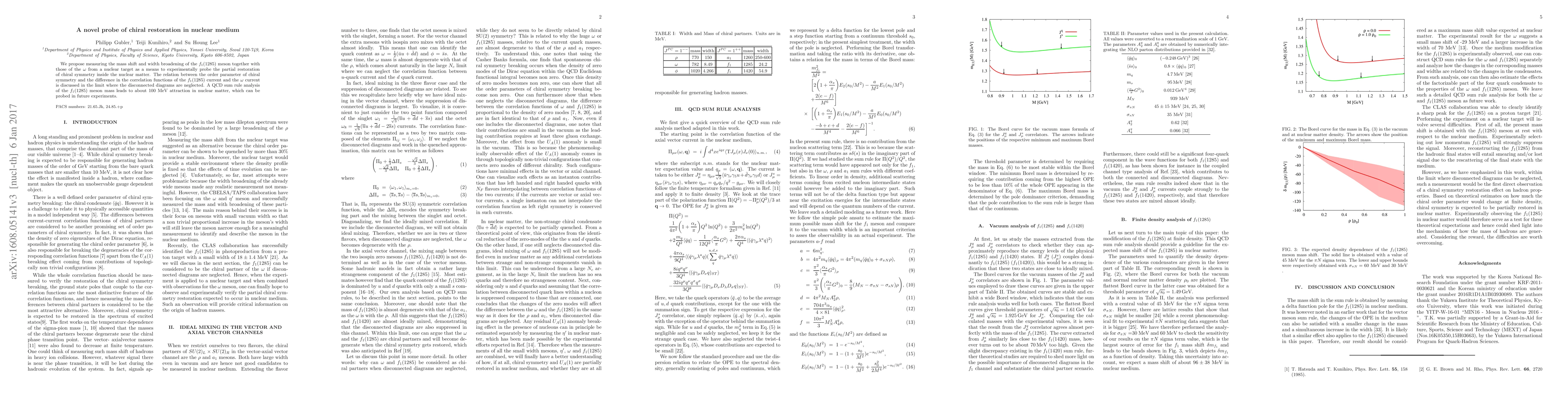 We propose measuring the mass shift and width broadening of the $f_1(1285)$ meson together with those of the $\omega$ from a nuclear target as a means to experimentally probe the partial restoration of chiral symmetry inside the nuclear matter. The relation between the order parameter of chiral symmetry and the difference in the correlation functions of the $f_1(1285)$ current and the $\omega$ current is discussed in the limit where the disconnected diagrams are neglected. A QCD sum rule analysis of the $f_1(1285)$ meson mass leads to about 100 MeV attraction in nuclear matter, which can be probed in future experiments.