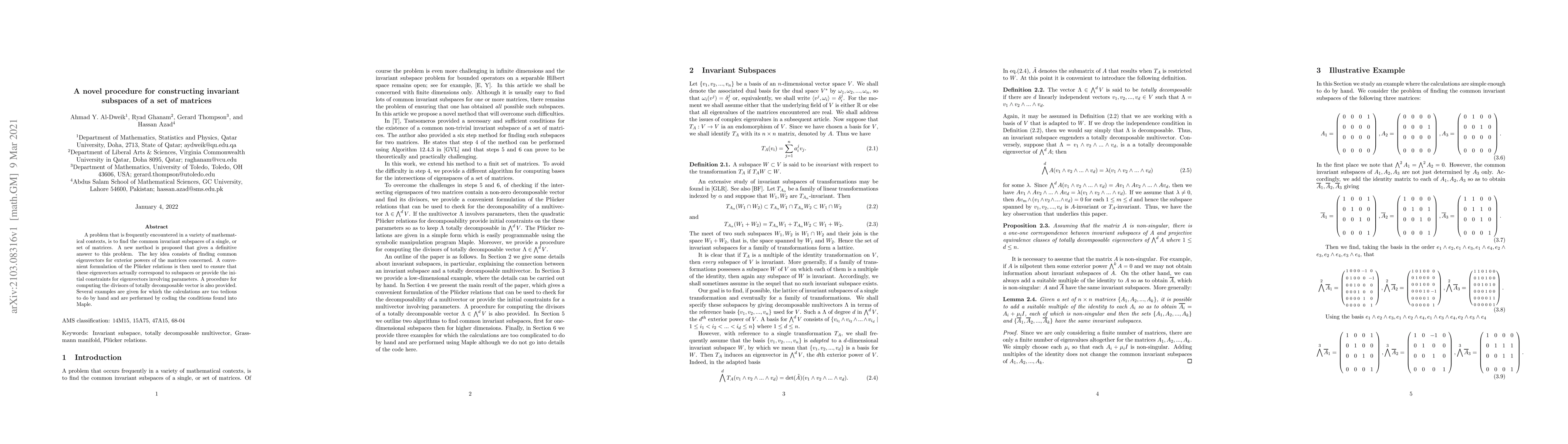 A problem that is frequently encountered in a variety of mathematical contexts, is to find the common invariant subspaces of a single, or set of matrices. A new method is proposed that gives a definitive answer to this problem. The key idea consists of finding common eigenvectors for exterior powers of the matrices concerned. A convenient formulation of the Pl\"ucker relations is then used to ensure that these eigenvectors actually correspond to subspaces or provide the initial constraints for eigenvectors involving parameters. A procedure for computing the divisors of totally decomposable vector is also provided. Several examples are given for which the calculations are too tedious to do by hand and are performed by coding the conditions found into Maple.