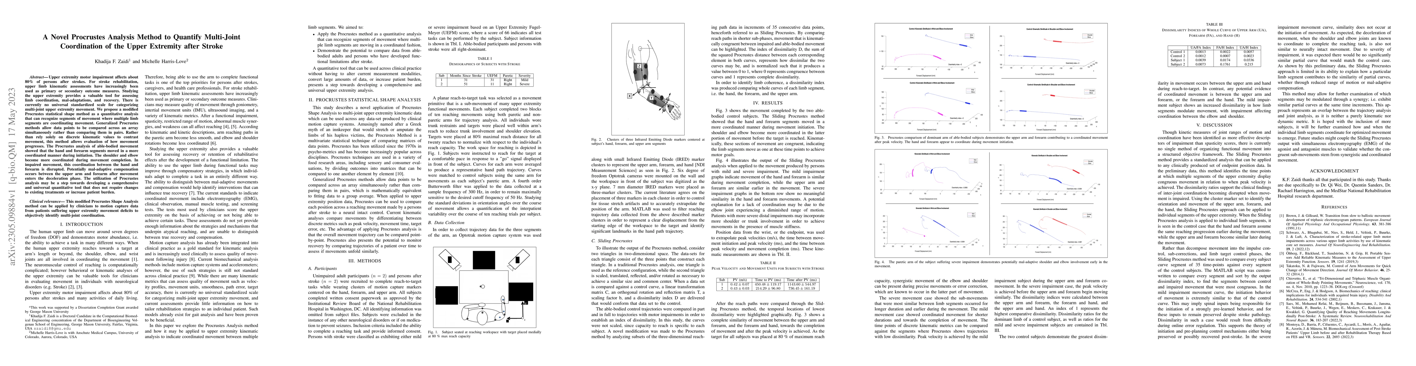 Upper extremity motor impairment affects about 80\% of persons after strokes. For stroke rehabilitation, upper limb kinematic assessments have increasingly been used as primary or secondary outcome measures. Studying the upper extremity provides a valuable tool for assessing limb coordination, mal-adaptations, and recovery. There is currently no universal standardized scale for categorizing multi-joint upper extremity movement. We propose a modified Procrustes statistical shape method as a quantitative analysis that can recognize segments of movement where multiple limb segments are coordinating movement. Generalized Procrustes methods allow data points to be compared across an array simultaneously rather than comparing them in pairs. Rather than rely solely on discrete kinematic values to contrast movement, this method allows evaluation of how movement progresses. The Procrustes analysis of able-bodied movement showed that the hand and forearm segments moved in a more coordinated manner during initiation. The shoulder and elbow become more coordinated during movement completion. In impaired movement, this coordination between the hand and forearm is disrupted. Potentially mal-adaptive compensation occurs between the upper arm and forearm after movement enters the deceleration phase. The utilization of Procrustes analysis may be a step towards developing a comprehensive and universal quantitative tool that does not require changes to existing treatments or increase patient burden. Copyright 2023 IEEE. Personal use of this material is permitted. Permission from IEEE must be obtained for all other uses, in any current or future media, including reprinting/republishing this material for advertising or promotional purposes, creating new collective works, for resale or redistribution to servers or lists, or reuse of any copyrighted component of this work in other works.