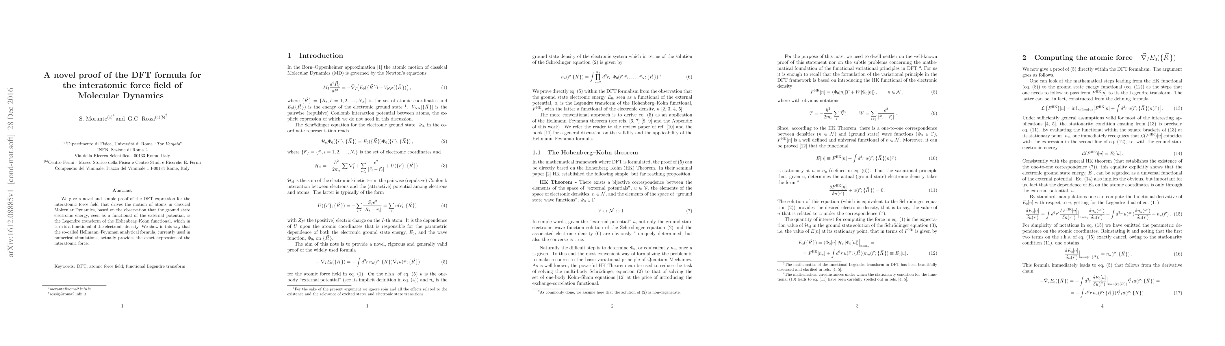 This paper presents a novel proof for the DFT formula for the interatomic force field in Molecular Dynamics, demonstrating that the Hellmann-Feynman theorem accurately represents the exact interatomic force by linking the ground state electronic energy to the Hohenberg-Kohn functional via the Legendre transform.