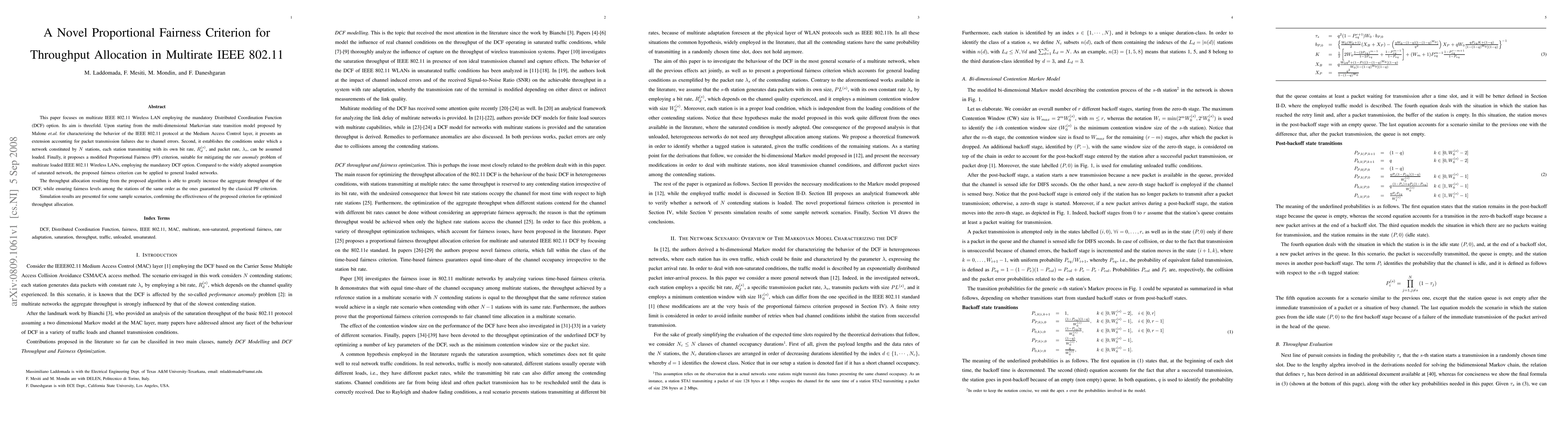 This paper proposes a novel Proportional Fairness criterion for throughput allocation in multirate IEEE 802.11 WLANs, addressing the rate anomaly problem and improving aggregate throughput while maintaining fairness, validated through simulations.