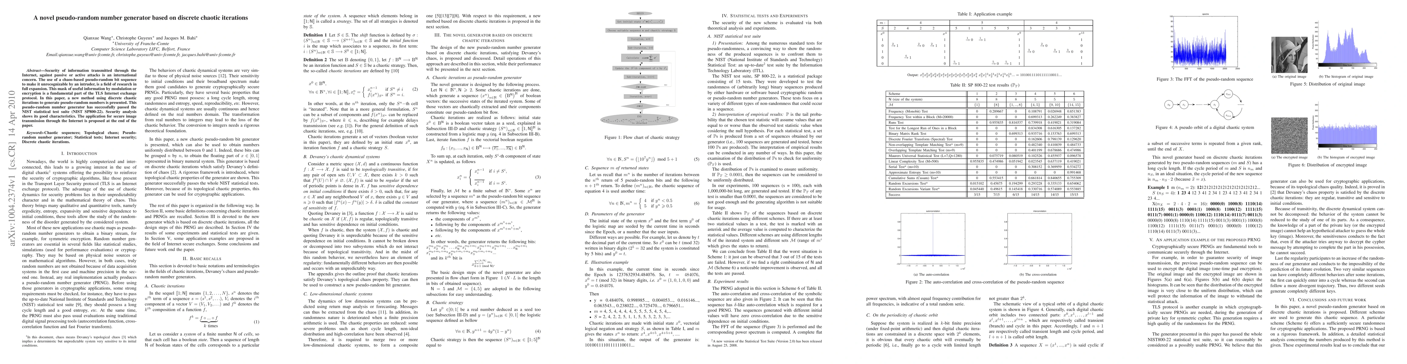 The paper presents a novel pseudo-random number generator (PRNG) based on discrete chaotic iterations, utilizing a logistic map and vectorial logical negation to produce sequences. The security of the proposed scheme is evaluated using the NIST statistical test suite (NIST SP800-22).