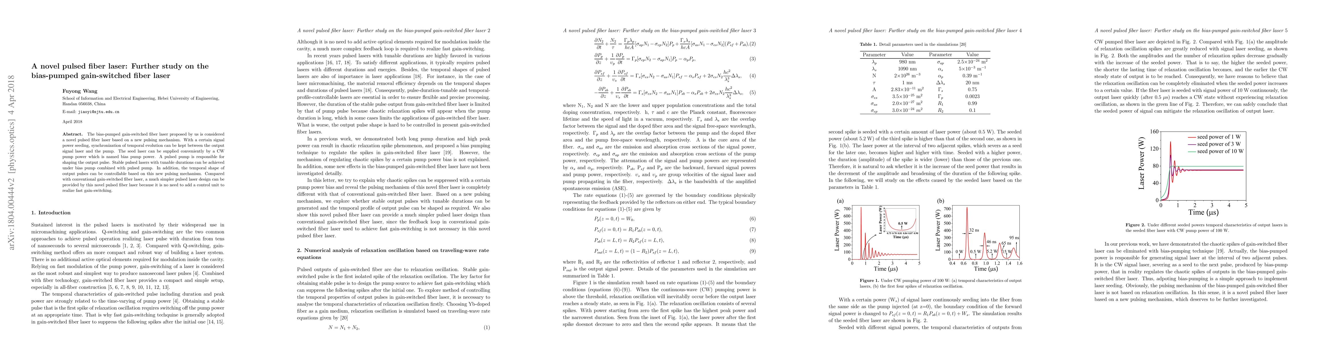 The bias-pumped gain-switched fiber laser proposed by us is considered a novel pulsed fiber laser based on a new pulsing mechanism. With a certain signal power seeding, synchronization of temporal evolution can be kept between the output signal laser and the pump. The seed laser can be supplied conveniently by a CW pump power which is named bias pump power. A pulsed pump is responsible for shaping the output pulse. Stable pulsed lasers with tunable durations can be achieved under bias pump combined with pulsed pump. In addition, the temporal shape of output pulses can be controllable based on this new pulsing mechanism. Compared with conventional gain-switched fiber laser, a much simpler pulsed laser design can be provided by this novel pulsed fiber laser because it is no need to add a control unit to realize fast gain-switching.