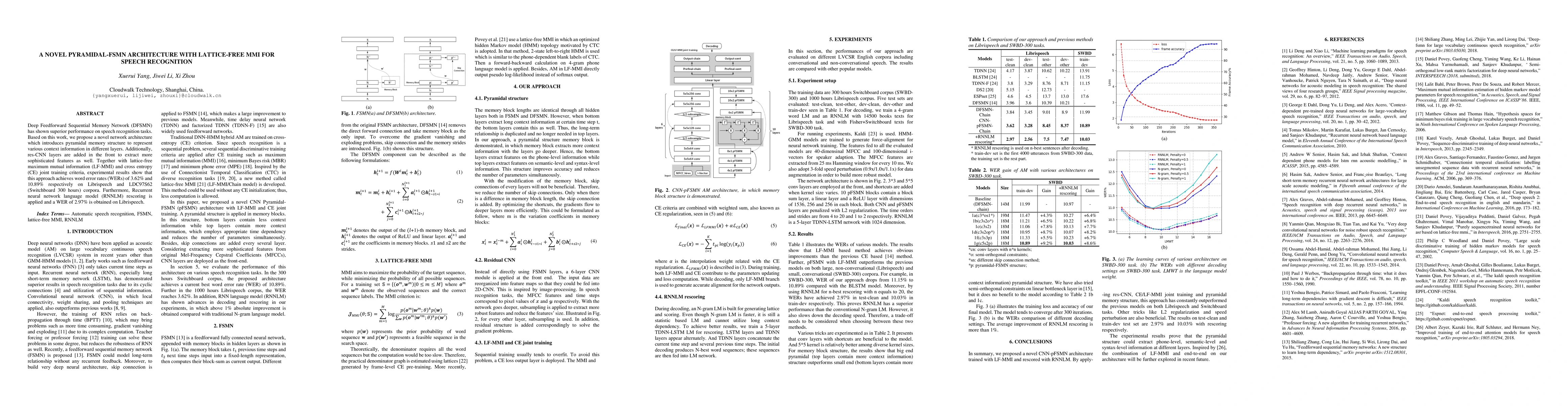 The paper proposes a novel pyramidal-FSMN architecture with lattice-free MMI for improved speech recognition, incorporating pyramidal memory structure and res-CNN layers, achieving WERs of 3.62% and 10.89% on Librispeech and Switchboard corpora, and further reducing WER to 2.97% with RNNLM rescoring.
