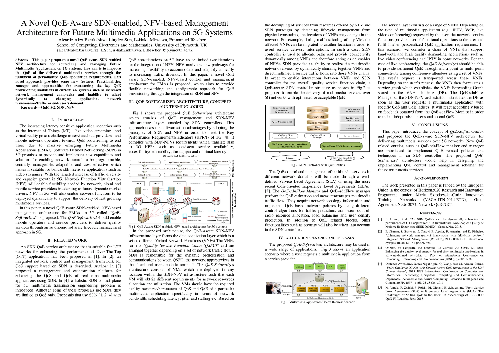 This paper introduces a novel QoE-aware SDN-enabled NFV architecture for managing future multimedia applications on 5G systems, aiming to enhance the quality of experience (QoE) by fulfilling personalized application requirements and addressing limitations of current 4G systems. The new approach offers advanced features to dynamically adapt to changing demands.