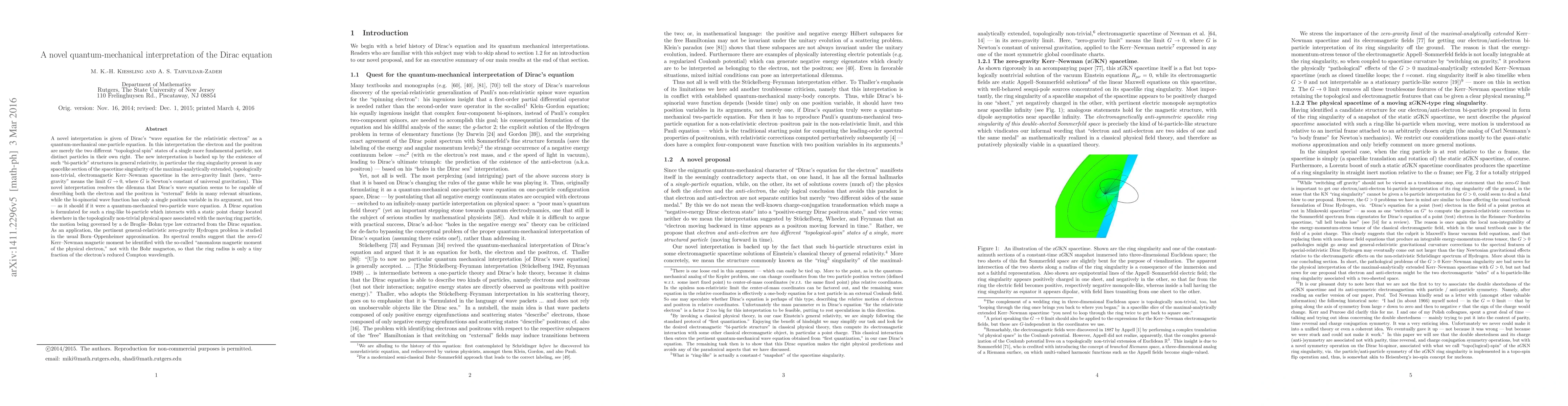 A novel interpretation is given of Dirac's "wave equation for the relativistic electron" as a quantum-mechanical one-particle equation. In this interpretation the electron and the positron are merely the two different "topological spin" states of a single more fundamental particle, not distinct particles in their own right. The new interpretation is backed up by the existence of such bi-particle structures in general relativity, in particular the ring singularity present in any spacelike section of the maximal analytically extended, topologically non-trivial, electromagnetic Kerr-Newman spacetime in the zero-gravity limit (here, "zero-gravity" means the limit $G\to 0$, where $G$ is Newton's constant of universal gravitation). This novel interpretation resolves the dilemma that Dirac's wave equation seems to be capable of describing both the electron and the positron in "external" fields in many relevant situations, while the bi-spinorial wave function has only a single position variable in its argument, not two - as it should if it were a two-particle equation! A Dirac equation is formulated for a ring-like bi-particle which interacts with a static point charges located elsewhere in the topologically non-trivial physical space associated with the moving ring bi-particle, the motion being governed by a de-Broglie-Bohm type law extracted from the Dirac equation. As an application, the pertinent general-relativistic zero-gravity Hydrogen problem is studied in the usual Born-Oppenheimer approximation. Its spectral results suggest that the zero-$G$ Kerr-Newman magnetic moment be identified with the so-called "anomalous magnetic moment of the physical electron," not with the Bohr magneton, so that the ring radius is only a tiny fraction of the electron's Compton wave length.