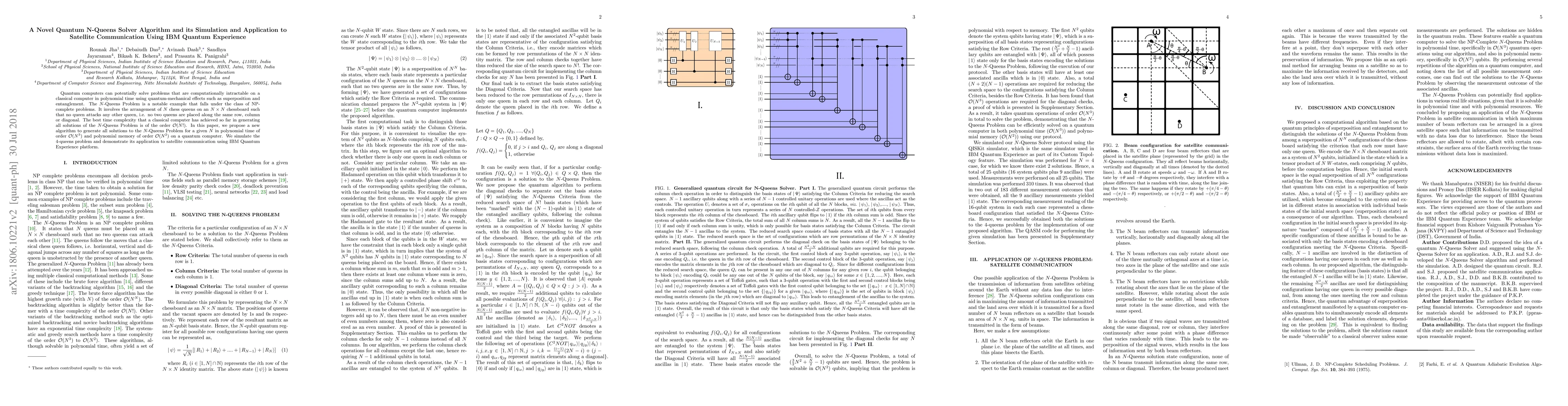 This paper presents a novel quantum algorithm to solve the N-Queens Problem in polynomial time O(N^3) with polynomial memory O(N^2), significantly outperforming classical methods. The algorithm is simulated for the 4-queens problem and demonstrated for satellite communication applications using IBM Quantum Experience.