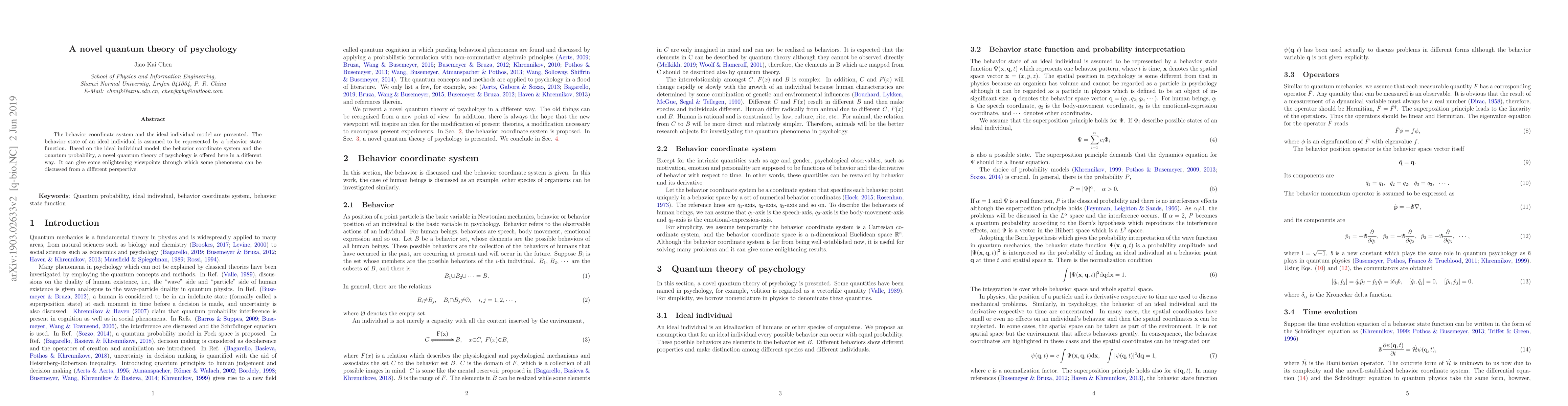 The behavior coordinate system and the ideal individual model are presented. The behavior state of an ideal individual is assumed to be represented by a behavior state function. Based on the ideal individual model, the behavior coordinate system and the quantum probability, a novel quantum theory of psychology is offered here in a different way. It can give some enlightening viewpoints through which some phenomena can be discussed from a different perspective.