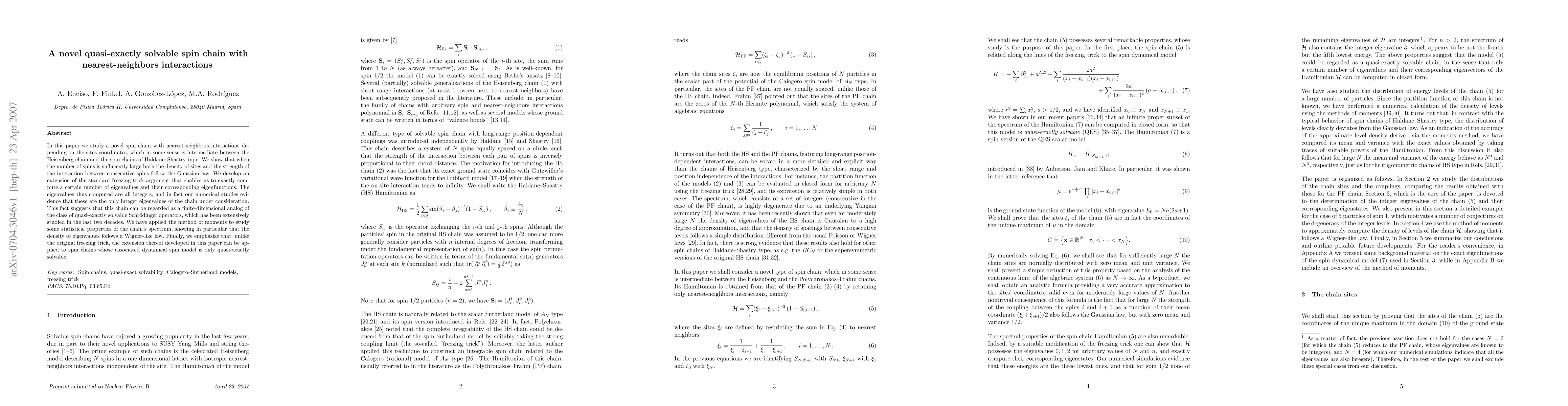 In this paper we study a novel spin chain with nearest-neighbors interactions depending on the sites coordinates, which in some sense is intermediate between the Heisenberg chain and the spin chains of Haldane-Shastry type. We show that when the number of spins is sufficiently large both the density of sites and the strength of the interaction between consecutive spins follow the Gaussian law. We develop an extension of the standard freezing trick argument that enables us to exactly compute a certain number of eigenvalues and their corresponding eigenfunctions. The eigenvalues thus computed are all integers, and in fact our numerical studies evidence that these are the only integer eigenvalues of the chain under consideration. This fact suggests that this chain can be regarded as a finite-dimensional analog of the class of quasi-exactly solvable Schroedinger operators, which has been extensively studied in the last two decades. We have applied the method of moments to study some statistical properties of the chain's spectrum, showing in particular that the density of eigenvalues follows a Wigner-like law. Finally, we emphasize that, unlike the original freezing trick, the extension thereof developed in this paper can be applied to spin chains whose associated dynamical spin model is only quasi-exactly solvable.