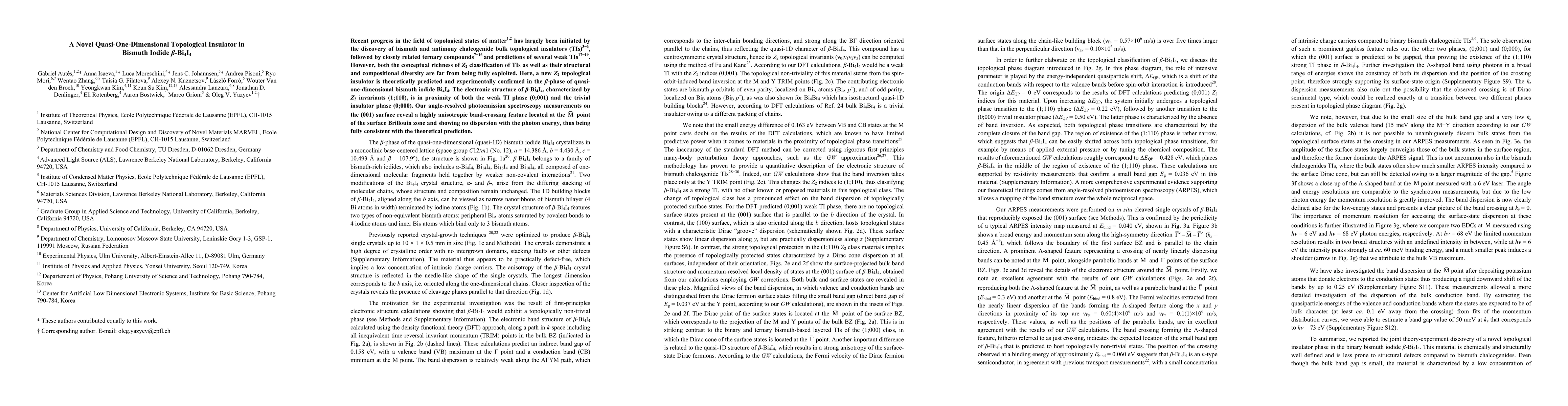 This paper reports the theoretical prediction and experimental confirmation of a novel quasi-one-dimensional topological insulator in $\beta$-Bi$_4$I$_4$, characterized by Z$_2$ invariants (1;110). Angle-resolved photoemission spectroscopy measurements reveal a highly anisotropic band-crossing feature, consistent with the predicted topological state.