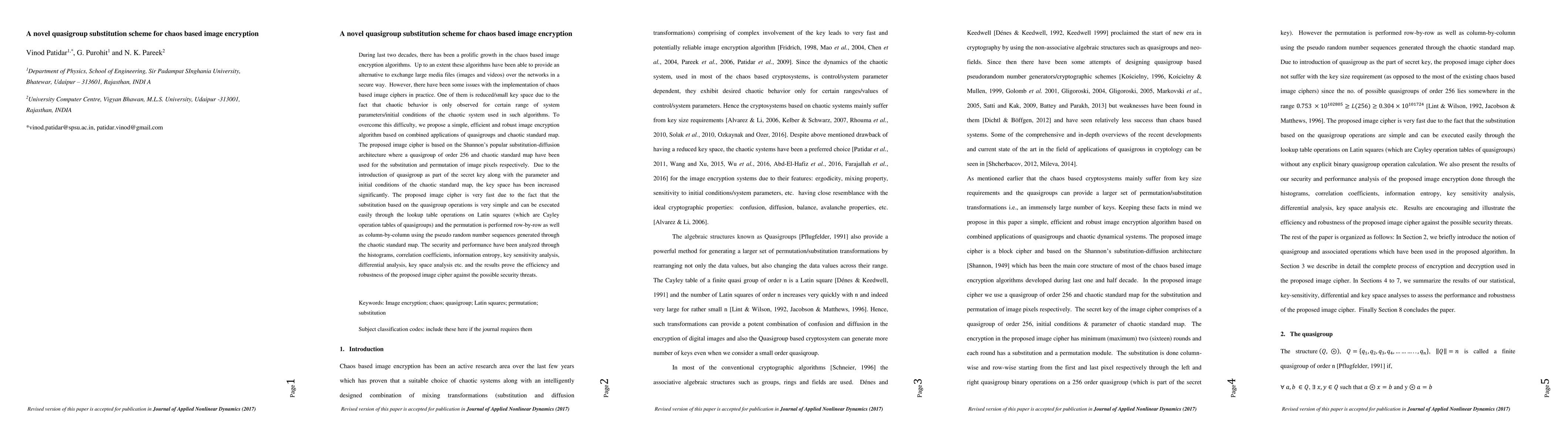 A During last two decades, there has been a prolific growth in the chaos based image encryption algorithms. Up to an extent these algorithms have been able to provide an alternative to exchange large media files (images and videos) over the networks in a secure way. However, there have been some issues with the implementation of chaos based image ciphers in practice. One of them is reduced/small key space due to the fact that chaotic behavior is only observed for certain range of system parameters/initial conditions of the chaotic system used in such algorithms. To overcome this difficulty, we propose a simple, efficient and robust image encryption algorithm based on combined applications of quasigroups and chaotic standard map. The proposed image cipher is based on the popular substitution-diffusion architecture (Shanon) where a quasigroup of order 256 and chaotic standard map have been used for the substitution and permutation of image pixels respectively. Due to the introduction of quasigroup as part of the secret key along with the parameter and initial conditions of the chaotic standard map, the key space has been increased significantly. The proposed image cipher is very fast due to the fact that the substitution based on the quasigroup operations is very simple and can be executed easily through the lookup table operations on Latin squares (which are Cayley operation tables of quasigroups) and the permutation is performed row-by-row as well as column-by-column using the pseudo random number sequences gener-ated through the chaotic standard map. The security and performance have been analyzed through the histograms, correlation coefficients, information entropy, key sensitivity analysis, differential analysis, key space analysis etc. and the results prove the efficiency and robustness of the proposed image cipher against the possible security threats.