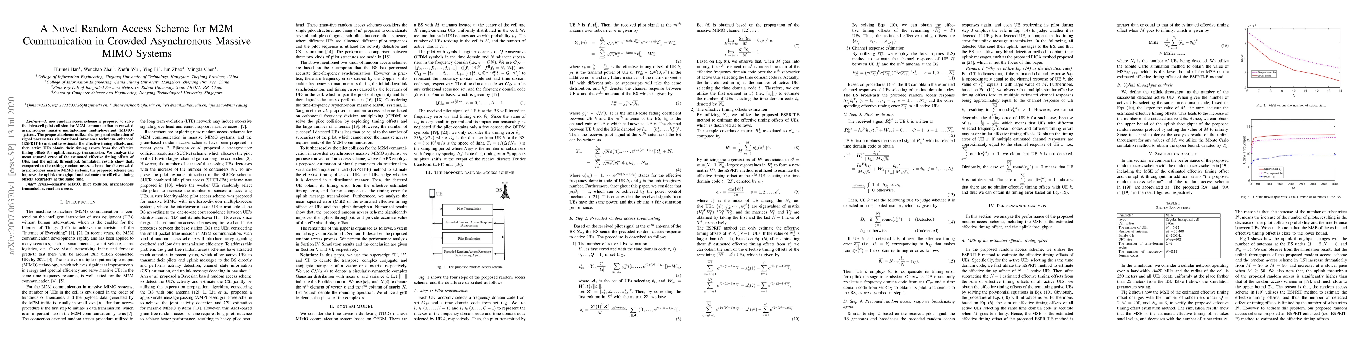This paper proposes a novel random access scheme to mitigate intra-cell pilot collision in crowded asynchronous massive MIMO systems for M2M communication. The scheme employs the ESPRIT-E method to estimate effective timing offsets, enhancing uplink throughput and accurate timing error estimation.