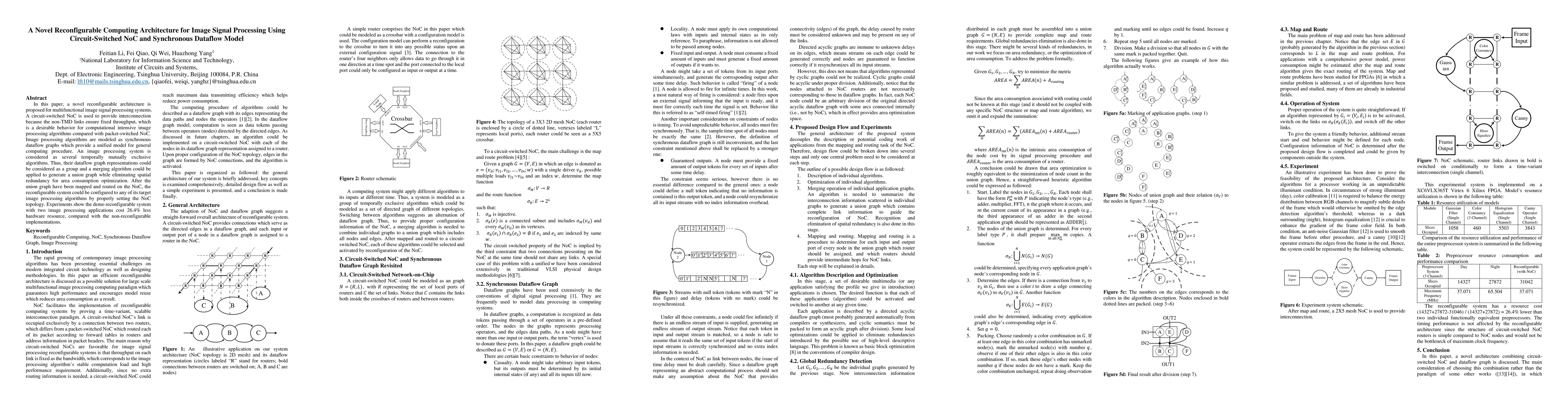 This paper proposes a reconfigurable architecture for image signal processing using a circuit-switched NoC and a synchronous dataflow model, achieving 26.4% less hardware resource compared to non-reconfigurable implementations by optimizing area consumption through a merging algorithm.