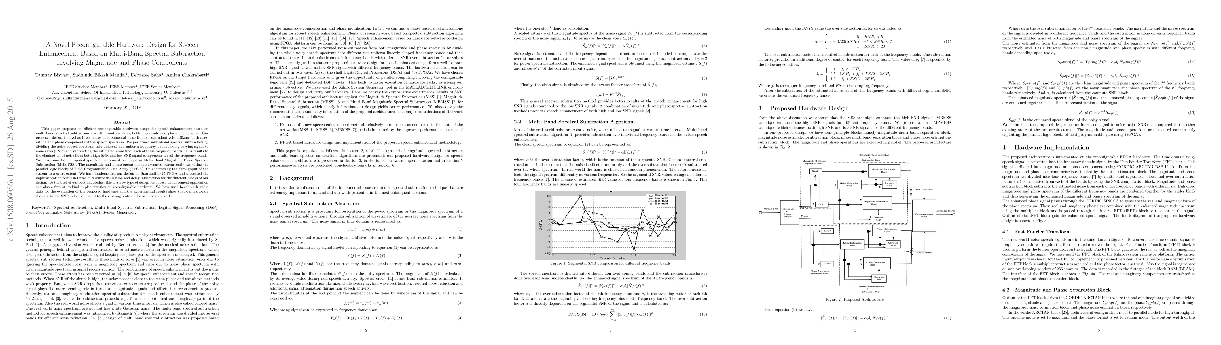 This paper proposes an innovative reconfigurable hardware design for speech enhancement using a novel Multi Band Magnitude Phase Spectral Subtraction (MBMPSS) technique, which adaptively estimates noise and enhances both high and low SNR signal components. Implemented on a Spartan6 FPGA, the design concurrently processes magnitude and phase components to improve throughput and outperforms existing methods in SNR.