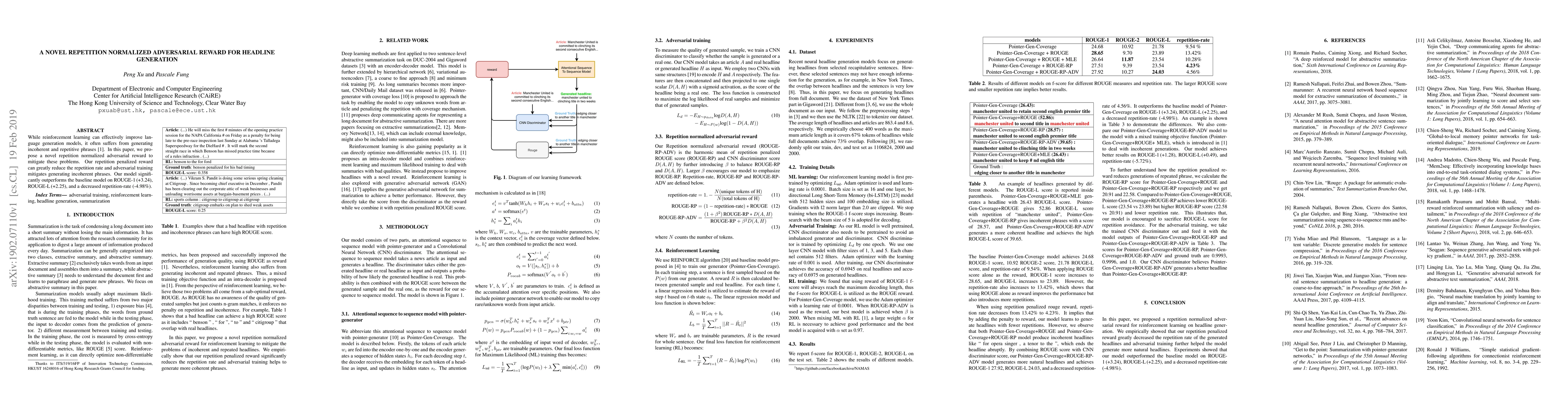 This paper introduces a novel repetition normalized adversarial reward to enhance headline generation using reinforcement learning. The proposed method effectively reduces repetition and incoherence, outperforming baseline models by improving ROUGE scores and decreasing repetition rates by 4.98%.