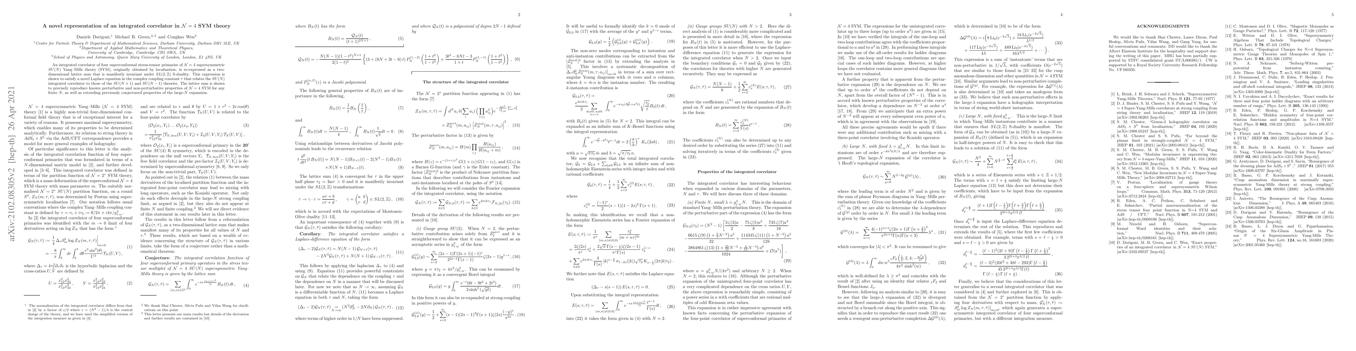This paper proposes a new lattice sum representation for an integrated correlator in $\mathcal{N}=4$ SYM theory, showing it is invariant under $SL(2,\mathbb{Z})$ S-duality and satisfies a Laplace equation linking correlators across different gauge group sizes.