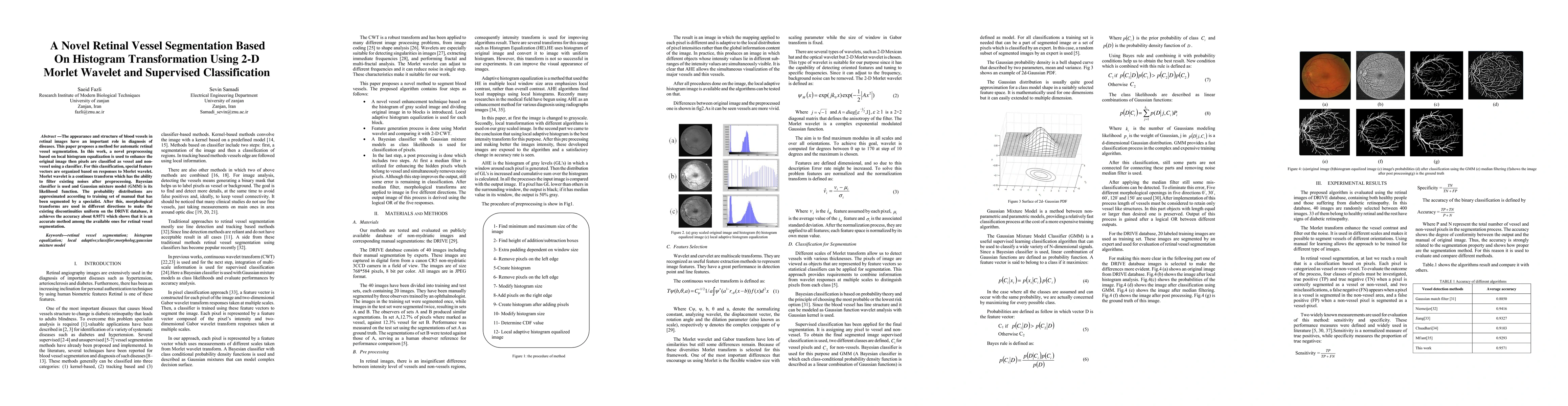 This paper presents a novel method for retinal vessel segmentation using local histogram equalization and 2-D Morlet wavelet for feature extraction, followed by Bayesian classification with Gaussian mixture model. The method achieves high accuracy of 0.9571 on the DRIVE database.
