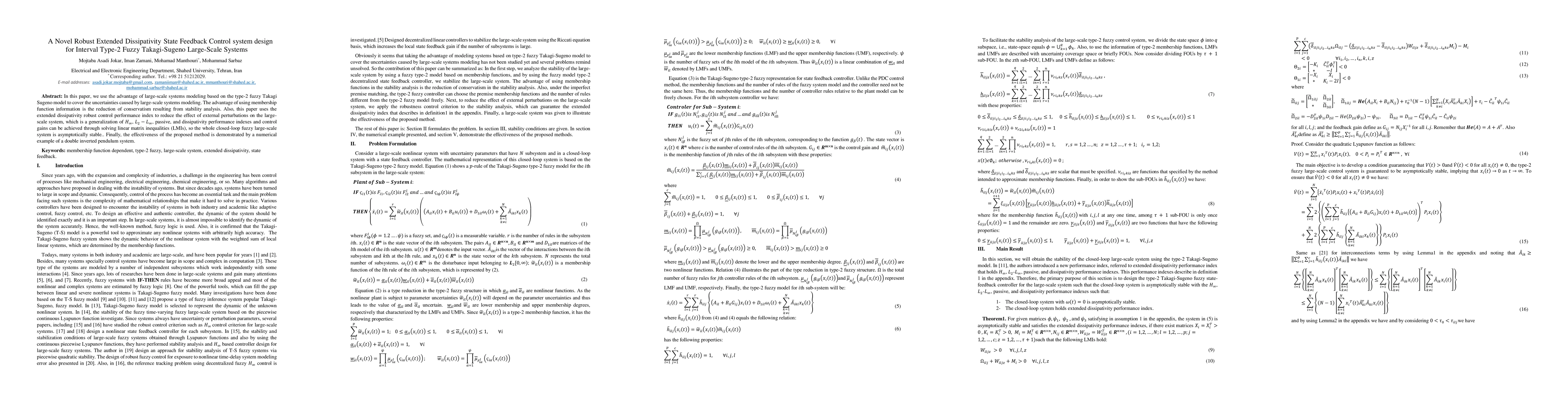 In this paper, we use the advantage of large-scale systems modeling based on the type-2 fuzzy Takagi-Sugeno model to cover the uncertainties caused by large-scale systems modeling. The advantage of using membership function information is the reduction of conservatism resulting from stability analysis. Also, this paper uses the extended dissipativity robust control performance index to reduce the effect of external perturbations on the large-scale system, which is a generalization of H, L, passive, and dissipativity performance indexes and control gains can be achieved through solving linear matrix inequalities (LMIs), so the whole closed-loop fuzzy large-scale system is asymptotically stable.. Finally, the effectiveness of the proposed method is demonstrated by a numerical example of a double inverted pendulum system.
