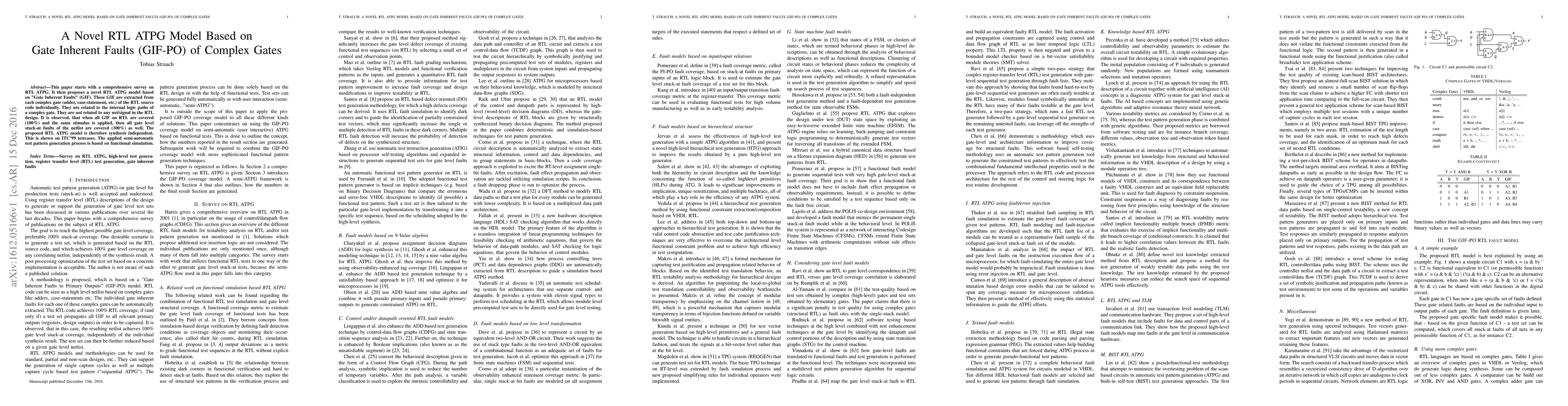 This paper proposes a novel RTL ATPG model based on "Gate Inherent Faults" (GIF) extracted from complex gates, which are related to internal logic paths and not to any net/signal. The model ensures 100% coverage of gate level stuck-at faults when all GIF are covered, demonstrating synthesis independence through ITC'99 testcases.