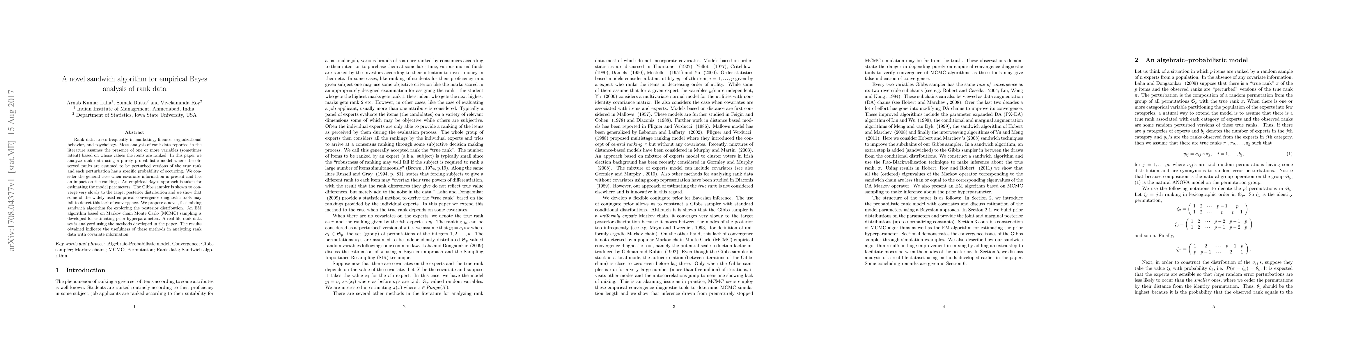 Rank data arises frequently in marketing, finance, organizational behavior, and psychology. Most analysis of rank data reported in the literature assumes the presence of one or more variables (sometimes latent) based on whose values the items are ranked. In this paper we analyze rank data using a purely probabilistic model where the observed ranks are assumed to be perturbed versions of the true rank and each perturbation has a specific probability of occurring. We consider the general case when covariate information is present and has an impact on the rankings. An empirical Bayes approach is taken for estimating the model parameters. The Gibbs sampler is shown to converge very slowly to the target posterior distribution and we show that some of the widely used empirical convergence diagnostic tools may fail to detect this lack of convergence. We propose a novel, fast mixing sandwich algorithm for exploring the posterior distribution. An EM algorithm based on Markov chain Monte Carlo (MCMC) sampling is developed for estimating prior hyperparameters. A real life rank data set is analyzed using the methods developed in the paper. The results obtained indicate the usefulness of these methods in analyzing rank data with covariate information.