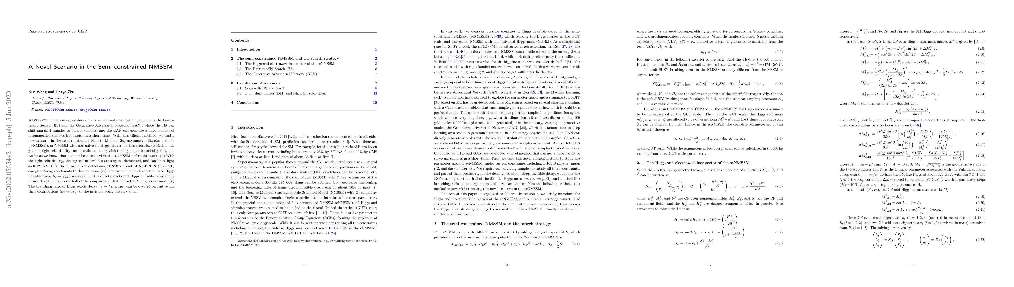 In this work, we develop a novel efficient scan method, combining the Heuristically Search (HS) and the Generative Adversarial Network (GAN), where the HS can shift marginal samples to perfect samples, and the GAN can generate a huge amount of recommended samples from noise in a short time. With this efficient method, we find a new scenario in the semi-constrained Next-to Minimal Supersymmetric Standard Model (scNMSSM), or NMSSM with non-universal Higgs masses. In this scenario, (i) Both muon g-2 and right relic density can be satisfied, along with the high mass bound of gluino, etc. As far as we know, that had not been realized in the scNMSSM before this work. (ii) With the right relic density, the lightest neutralinos are singlino-dominated, and can be as light as 0-12 GeV. (iii) The future direct detections XENONnT and LUX-ZEPLIN (LZ-7 2T) can give strong constraints to this scenario. (iv) The current indirect constraints to Higgs invisible decay $h_2\to \tilde{\chi}^0_1 \tilde{\chi}^0_1$ are weak, but the direct detection of Higgs invisible decay at the future HL-LHC may cover half of the samples, and that of the CEPC may cover most. (v) The branching ratio of Higgs exotic decay $h_2\to h_1h_1, a_1a_1$ can be over 20 percent, while their contributions to the invisible decay $h_2\to4\chi_1^0$ are very small.