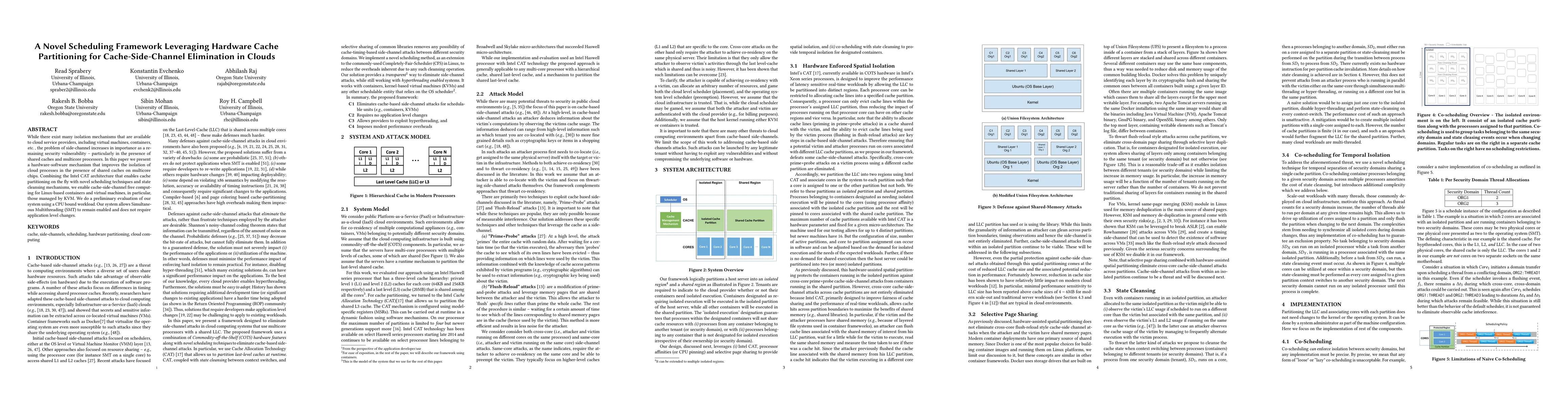This paper introduces a novel scheduling framework that leverages hardware cache partitioning to eliminate cache-side-channel attacks in cloud environments. It combines Intel CAT architecture with new scheduling and state cleansing techniques to enhance isolation for Linux-based containers and virtual machines managed by KVM, without requiring application modifications.