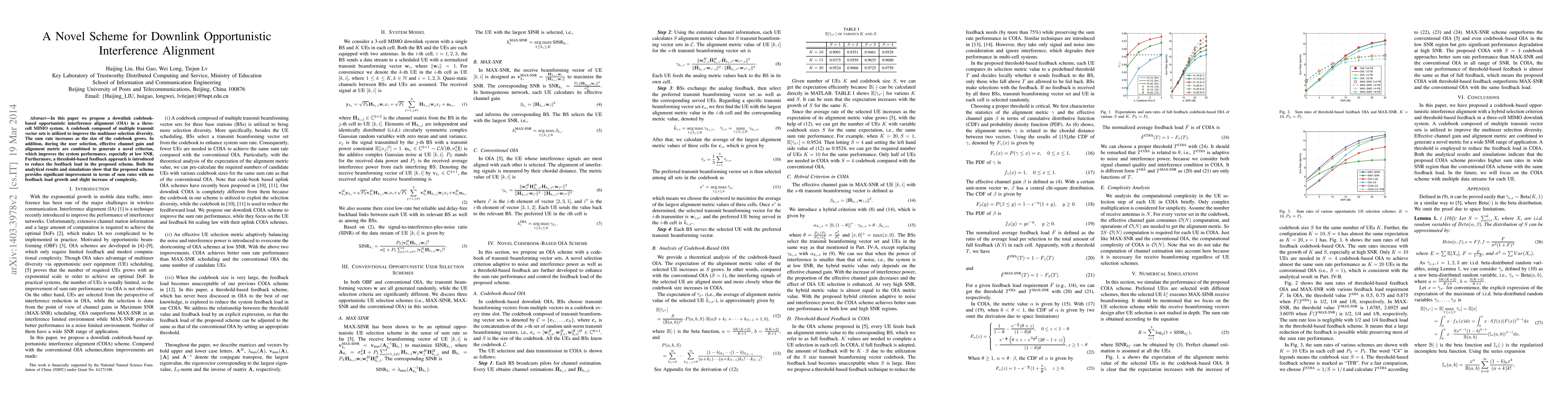 In this paper we propose a downlink codebook-based opportunistic interference alignment (OIA) in a three-cell MIMO system. A codebook composed of multiple transmit vector sets is utilized to improve the multiuser selection diversity. The sum rate increases as the size of the codebook grows. In addition, during the user selection, effective channel gain and alignment metric are combined to generate a novel criterion, which improves the system performance, especially at low SNR. Furthermore, a threshold-based feedback approach is introduced to reduce the feedback load in the proposed scheme. Both the analytical results and simulations show that the proposed scheme provides significant improvement in terms of sum rates with no feedback load growth and slight increase of complexity.