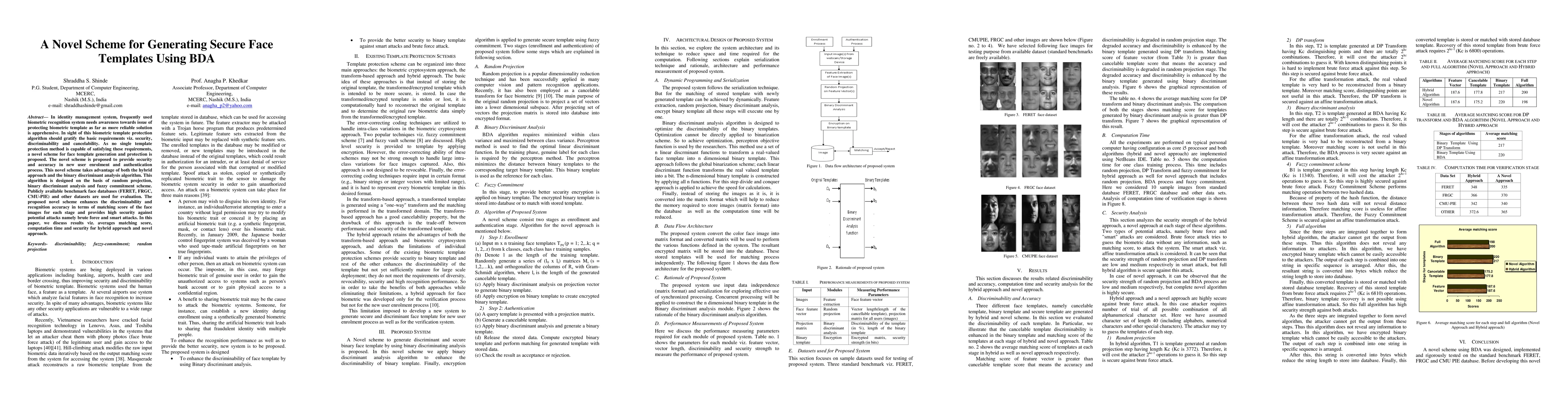 In identity management system, frequently used biometric recognition system needs awareness towards issue of protecting biometric template as far as more reliable solution is apprehensive. In sight of this biometric template protection algorithm should gratify the basic requirements viz. security, discriminability and cancelability. As no single template protection method is capable of satisfying these requirements, a novel scheme for face template generation and protection is proposed. The novel scheme is proposed to provide security and accuracy in new user enrolment and authentication process. This novel scheme takes advantage of both the hybrid approach and the binary discriminant analysis algorithm. This algorithm is designed on the basis of random projection, binary discriminant analysis and fuzzy commitment scheme. Publicly available benchmark face databases (FERET, FRGC, CMU-PIE) and other datasets are used for evaluation. The proposed novel scheme enhances the discriminability and recognition accuracy in terms of matching score of the face images for each stage and provides high security against potential attacks namely brute force and smart attacks. In this paper, we discuss results viz. averages matching score, computation time and security for hybrid approach and novel approach.