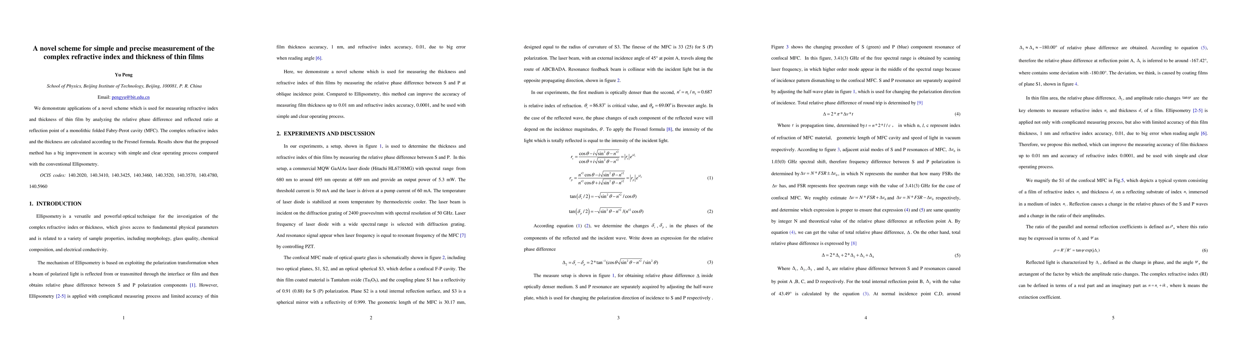 This paper introduces a novel method for measuring the complex refractive index and thickness of thin films using a folded Fabry-Perot cavity, showing significant accuracy improvements over conventional ellipsometry with a simpler operation process.