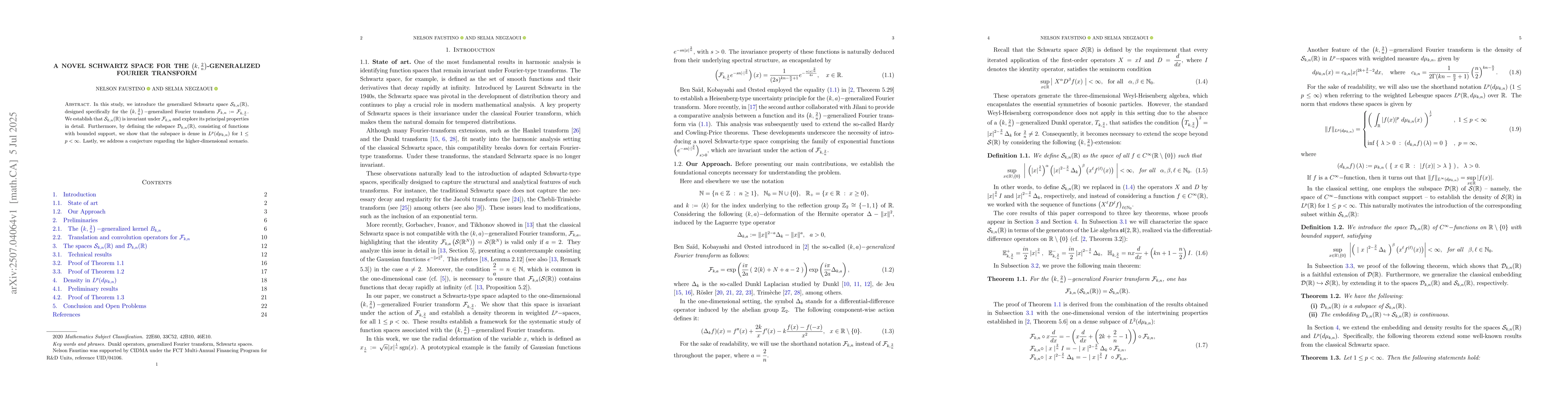 In this study, we introduce the generalized Schwartz space $\mathcal{S}_{k,n}(\mathbb{R})$, designed specifically for the $\left(k,\frac{2}{n}\right)-$generalized Fourier transform $\mathcal{F}_{k,n}:=\mathcal{F}_{k,\frac{2}{n}}$. We establish that $\mathcal{S}_{k,n}(\mathbb{R})$ is invariant under $\mathcal{F}_{k,n}$ and explore its principal properties in detail. Furthermore, by defining the subspace $\mathcal{D}_{k,n}(\mathbb{R})$, consisting of functions with bounded support, we show that the subspace is dense in $L^p(d\mu_{k,n})$ for $1 \leq p < \infty$. Lastly, we address a conjecture regarding the higher-dimensional scenario.