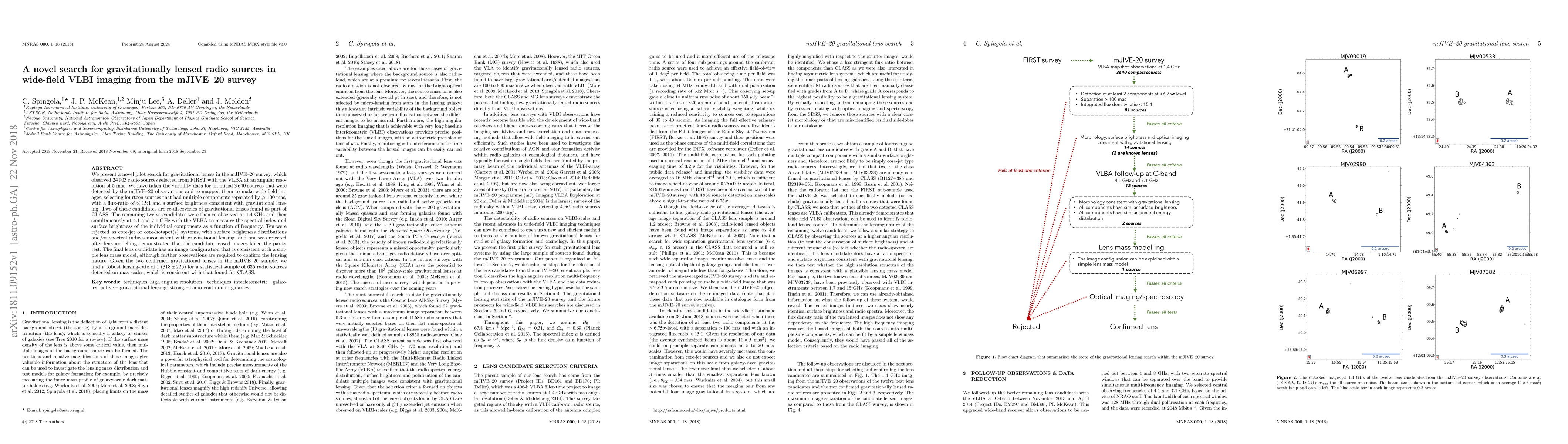 We present a novel pilot search for gravitational lenses in the mJIVE-20 survey, which observed $24\,903$ radio sources selected from FIRST with the VLBA at an angular resolution of 5 mas. We have taken the visibility data for an initial $3\,640$ sources that were detected by the mJIVE-20 observations and re-mapped them to make wide-field images, selecting fourteen sources that had multiple components separated by $\geq100$ mas, with a flux-ratio of $\leq15$:$1$ and a surface brightness consistent with gravitational lensing. Two of these candidates are re-discoveries of gravitational lenses found as part of CLASS. The remaining twelve candidates were then re-observed at 1.4 GHz and then simultaneously at 4.1 and 7.1 GHz with the VLBA to measure the spectral index and surface brightness of the individual components as a function of frequency. Ten were rejected as core-jet or core-hotspot(s) systems, with surface brightness distributions and/or spectral indices inconsistent with gravitational lensing, and one was rejected after lens modelling demonstrated that the candidate lensed images failed the parity test. The final lens candidate has an image configuration that is consistent with a simple lens mass model, although further observations are required to confirm the lensing nature. Given the two confirmed gravitational lenses in the mJIVE-20 sample, we find a robust lensing-rate of $1$:($318\pm225$) for a statistical sample of 635 radio sources detected on mas-scales, which is consistent with that found for CLASS.