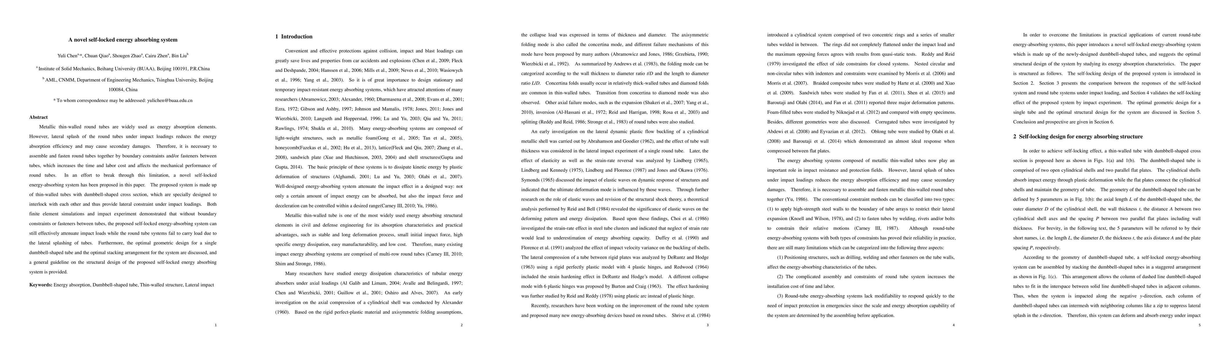 Metallic thin-walled round tubes are widely used as energy absorption elements. However, lateral splash of the round tubes under impact loadings reduces the energy absorption efficiency and may cause secondary damages. Therefore, it is necessary to assemble and fasten round tubes together by boundary constraints and/or fasteners between tubes, which increases the time and labor cost and affects the mechanical performance of round tubes. In an effort to break through this limitation, a novel self-locked energy-absorbing system has been proposed in this paper. The proposed system is made up of thin-walled tubes with dumbbell-shaped cross section, which are specially designed to interlock with each other and thus provide lateral constraint under impact loadings. Both finite element simulations and impact experiment demonstrated that without boundary constraints or fasteners between tubes, the proposed self-locked energy-absorbing system can still effectively attenuate impact loads while the round tube systems fail to carry load due to the lateral splashing of tubes. Furthermore, the optimal geometric design for a single dumbbell-shaped tube and the optimal stacking arrangement for the system are discussed, and a general guideline on the structural design of the proposed self-locked energy absorbing system is provided.