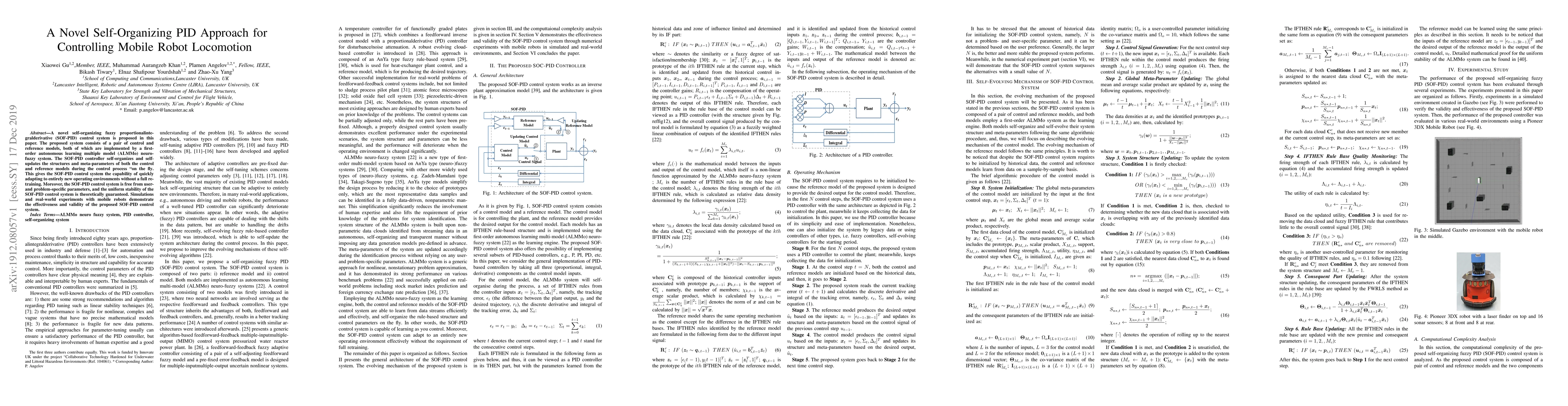 The paper proposes a novel self-organizing fuzzy PID (SOF-PID) control system for mobile robot locomotion using autonomous learning multiple model neuro-fuzzy systems. The system adapts in real-time without full retraining, ensuring uniform stability and effectiveness as demonstrated through simulations and experiments.