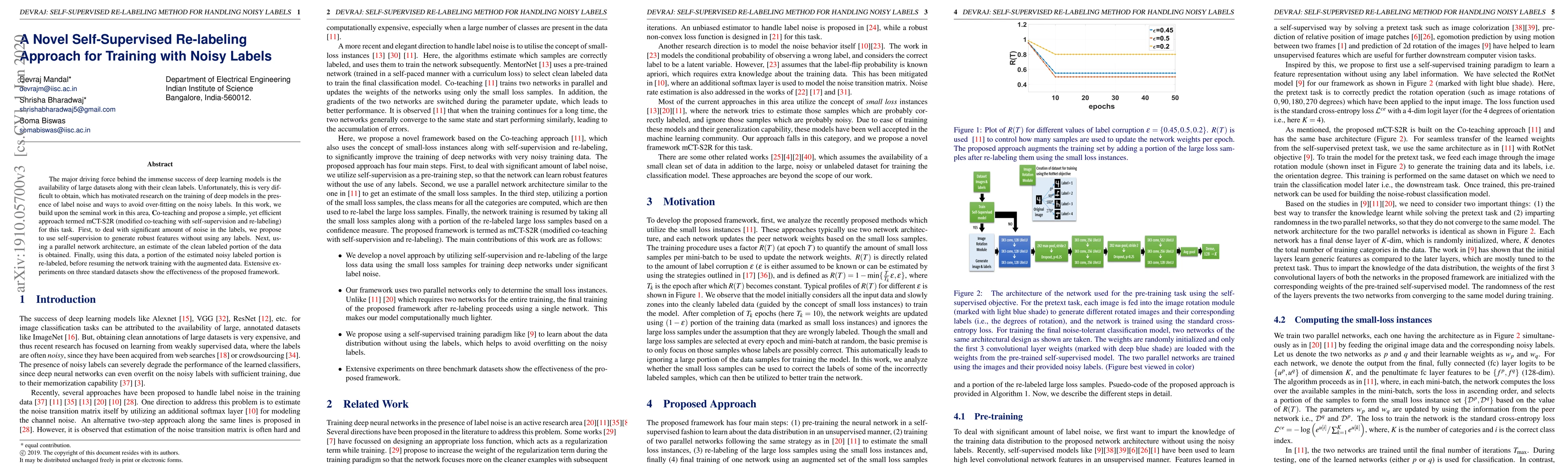 The major driving force behind the immense success of deep learning models is the availability of large datasets along with their clean labels. Unfortunately, this is very difficult to obtain, which has motivated research on the training of deep models in the presence of label noise and ways to avoid over-fitting on the noisy labels. In this work, we build upon the seminal work in this area, Co-teaching and propose a simple, yet efficient approach termed mCT-S2R (modified co-teaching with self-supervision and re-labeling) for this task. First, to deal with significant amount of noise in the labels, we propose to use self-supervision to generate robust features without using any labels. Next, using a parallel network architecture, an estimate of the clean labeled portion of the data is obtained. Finally, using this data, a portion of the estimated noisy labeled portion is re-labeled, before resuming the network training with the augmented data. Extensive experiments on three standard datasets show the effectiveness of the proposed framework.