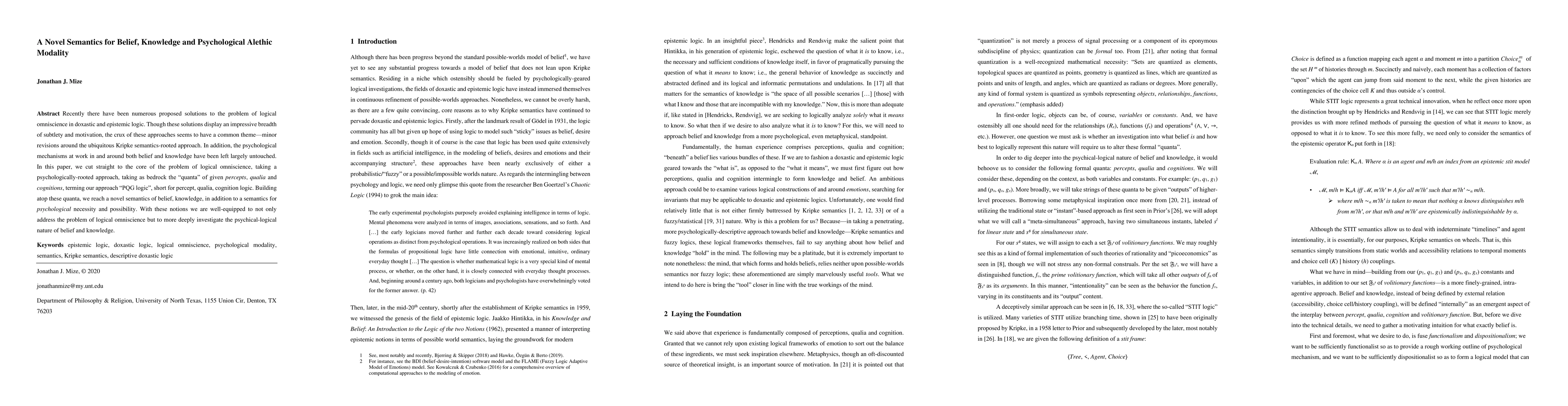 This paper proposes a novel "PQG logic" to tackle the problem of logical omniscience in doxastic and epistemic logic, focusing on psychological mechanisms and grounding semantics in percepts, qualia, and cognitions. It introduces a new semantics for belief, knowledge, and psychological alethic modality.