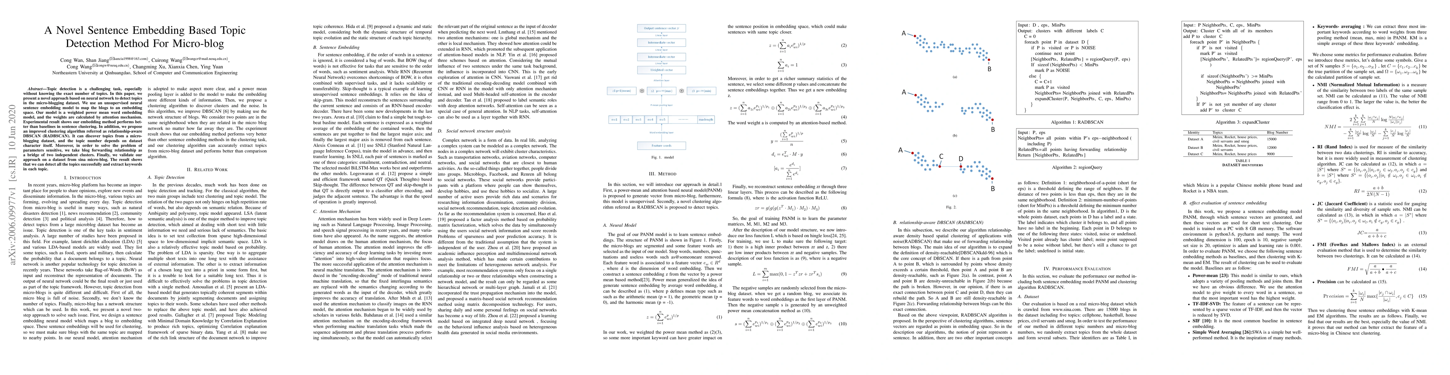 Topic detection is a challenging task, especially without knowing the exact number of topics. In this paper, we present a novel approach based on neural network to detect topics in the micro-blogging dataset. We use an unsupervised neural sentence embedding model to map the blogs to an embedding space. Our model is a weighted power mean word embedding model, and the weights are calculated by attention mechanism. Experimental result shows our embedding method performs better than baselines in sentence clustering. In addition, we propose an improved clustering algorithm referred as relationship-aware DBSCAN (RADBSCAN). It can discover topics from a micro-blogging dataset, and the topic number depends on dataset character itself. Moreover, in order to solve the problem of parameters sensitive, we take blog forwarding relationship as a bridge of two independent clusters. Finally, we validate our approach on a dataset from sina micro-blog. The result shows that we can detect all the topics successfully and extract keywords in each topic.
