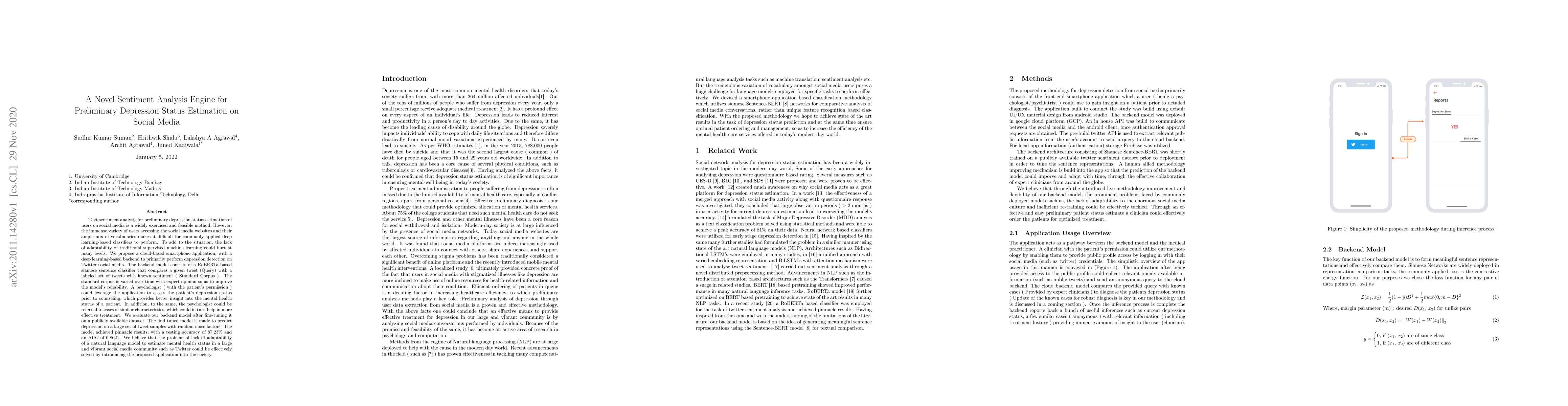 Text sentiment analysis for preliminary depression status estimation of users on social media is a widely exercised and feasible method, However, the immense variety of users accessing the social media websites and their ample mix of vocabularies makes it difficult for commonly applied deep learning-based classifiers to perform. To add to the situation, the lack of adaptability of traditional supervised machine learning could hurt at many levels. We propose a cloud-based smartphone application, with a deep learning-based backend to primarily perform depression detection on Twitter social media. The backend model consists of a RoBERTa based siamese sentence classifier that compares a given tweet (Query) with a labeled set of tweets with known sentiment ( Standard Corpus ). The standard corpus is varied over time with expert opinion so as to improve the model's reliability. A psychologist ( with the patient's permission ) could leverage the application to assess the patient's depression status prior to counseling, which provides better insight into the mental health status of a patient. In addition, to the same, the psychologist could be referred to cases of similar characteristics, which could in turn help in more effective treatment. We evaluate our backend model after fine-tuning it on a publicly available dataset. The find tuned model is made to predict depression on a large set of tweet samples with random noise factors. The model achieved pinnacle results, with a testing accuracy of 87.23% and an AUC of 0.8621.